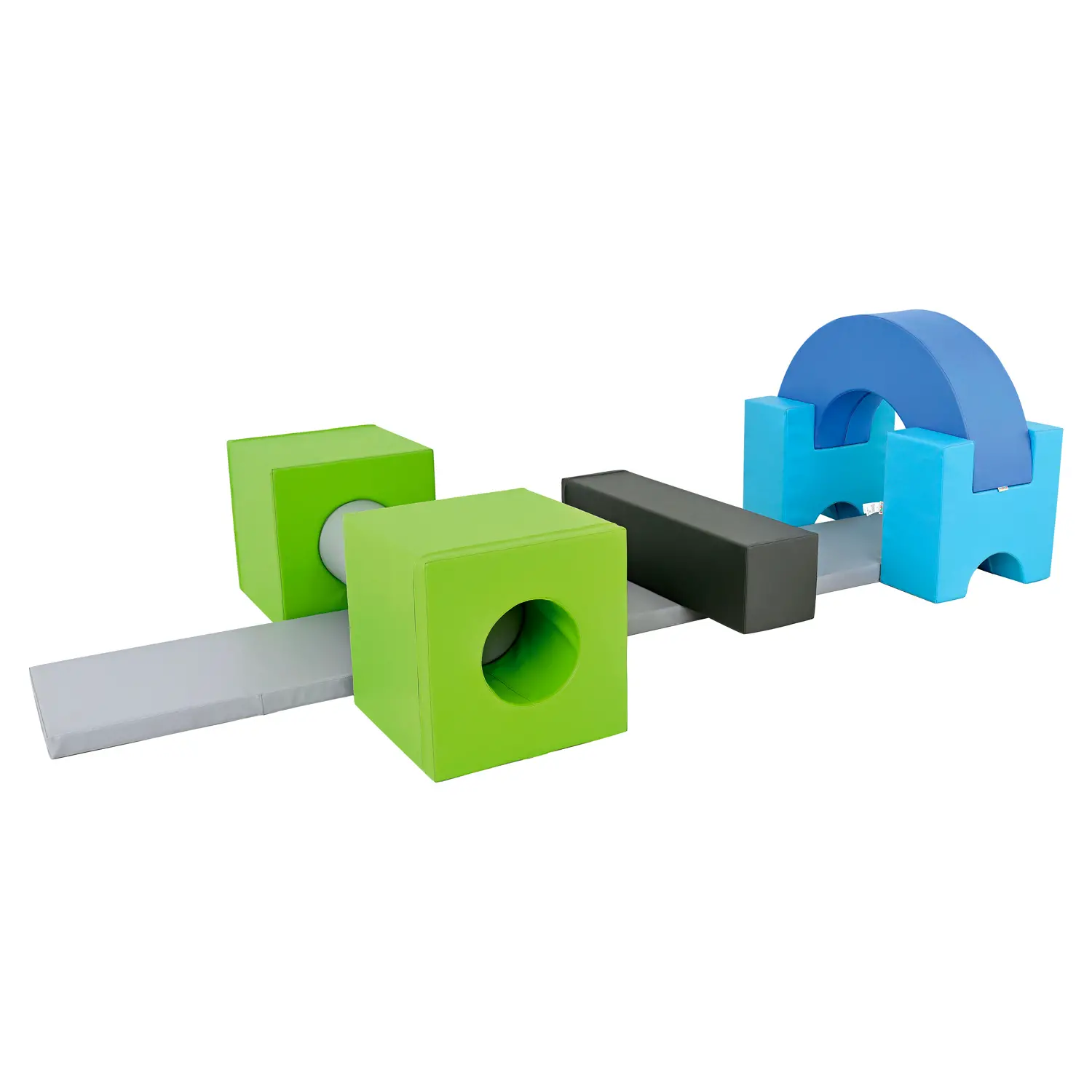 Il set include: - 2 basi grandi cm. 60x30x60 - 2 cubi con foro cm.60x60x60 - foro ø 30 cm. - 1 semi-cerchio cm. 120x30x60 - 1 cilindro cm. 120x30 - 1 trave grande cm. 100x30x30 - 3 materassini cm. 60x120x7