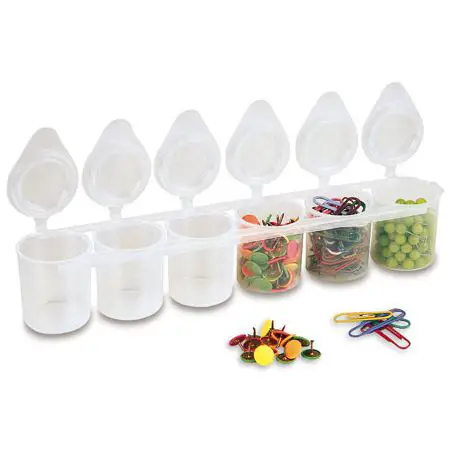 Contenitori Multiuso a 6 Scomparti - Perfetti per organizzare piccoli oggetti, questi 6 barattolini uniti sono realizzati in plastica traslucida e dotati di coperchio con chiusura a pressione.
