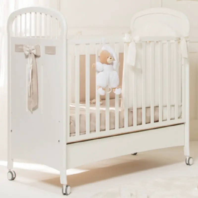Il lettino color bianco è in legno MDF laccato con vernice atossica a base di acqua di colore panna, nel rispetto delle norme europee.
