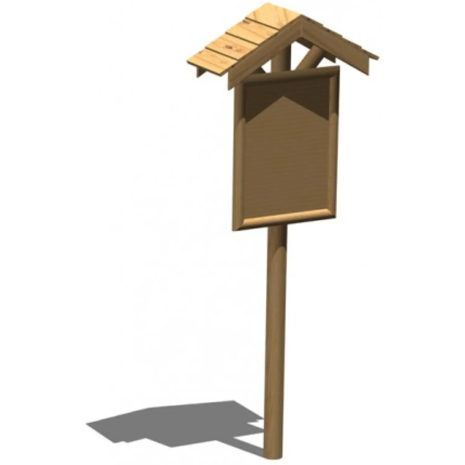 Bacheca monofacciale in legno composta da un montante Ø 10 cm a supporto di una tabella di affissione realizzata in legno multistrato per esterno e incorniciata da elementi a sezione tonda Ø 6 cm. La copertura a 2 falde é composta da perline a “scandola” con incastro (spessore 20 mm). Completa di elementi di rifinitura e ferramenta zincata a caldo. La struttura va fissata a terra mediante fondazioni in calcestruzzo.