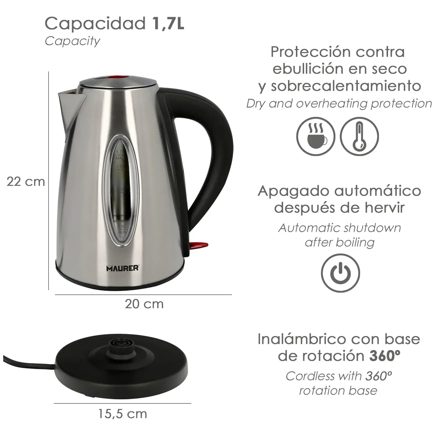 - ✅ Bollitore elettrico Maurer 1,7 litri 2200W per riscaldamento rapido acqua, ideale per tè, tisane e bevande calde