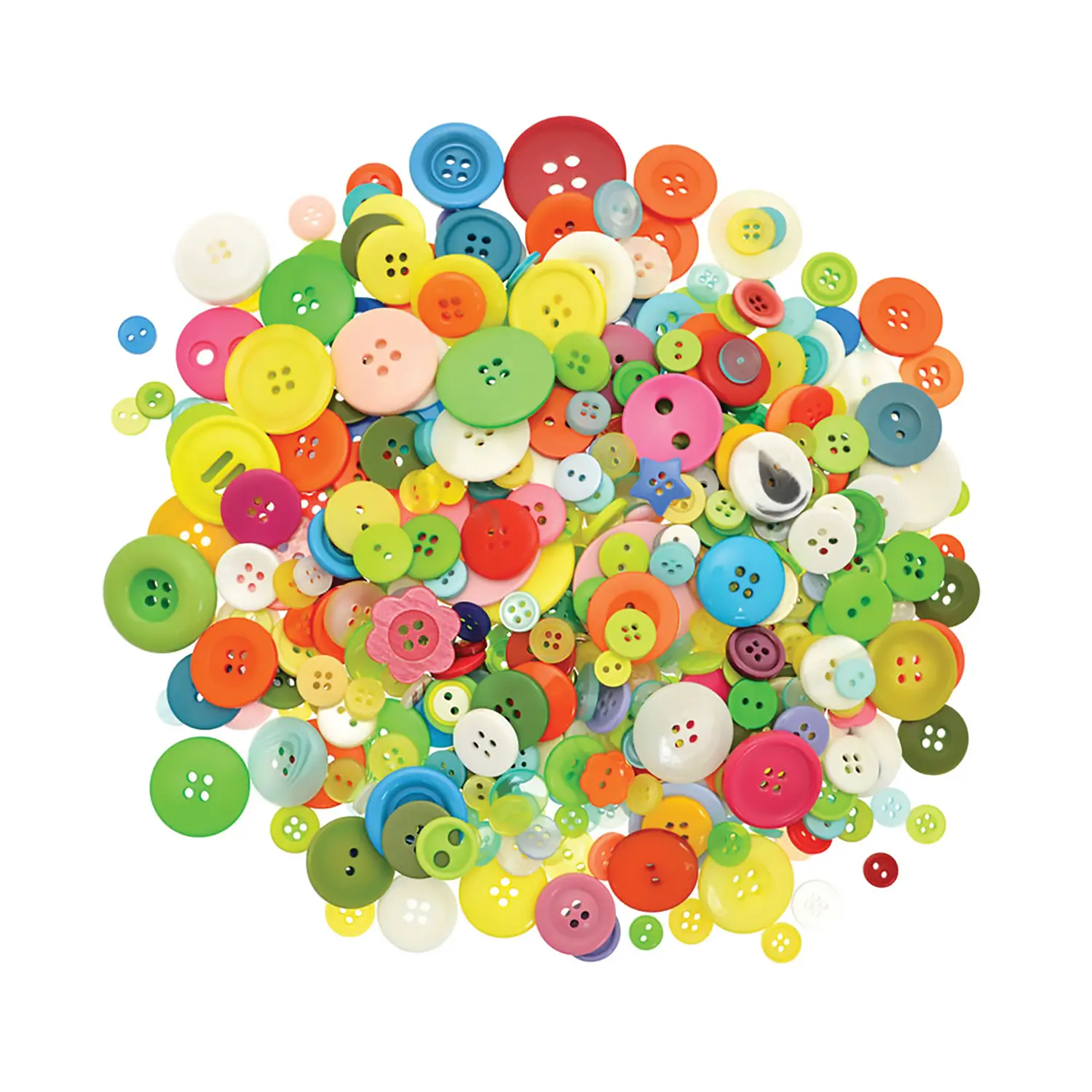 - Quantità e varietà: Circa 1000 bottoni in plastica colorata, assortiti in diverse dimensioni e tonalità vivaci.