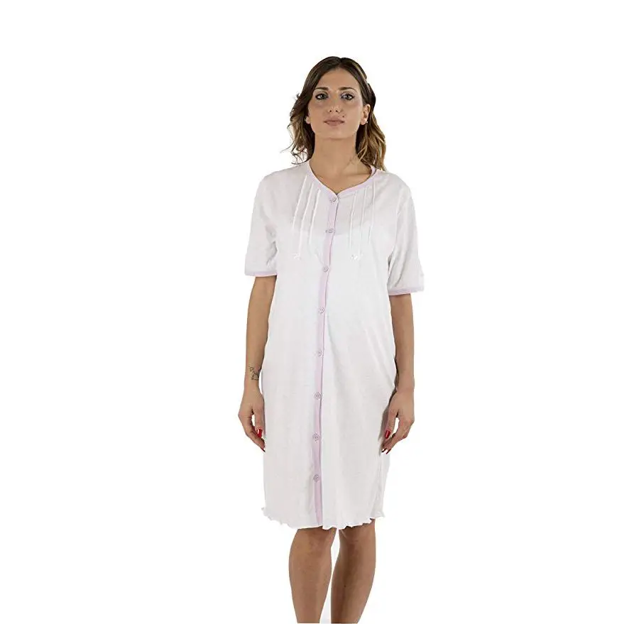 Questa camicia da notte è stata progettata per la gravidanza e l'allattamento. La composizione è fatta con puro cotone anallergico ideale per pelli sensibili e facilmente irritabili.
