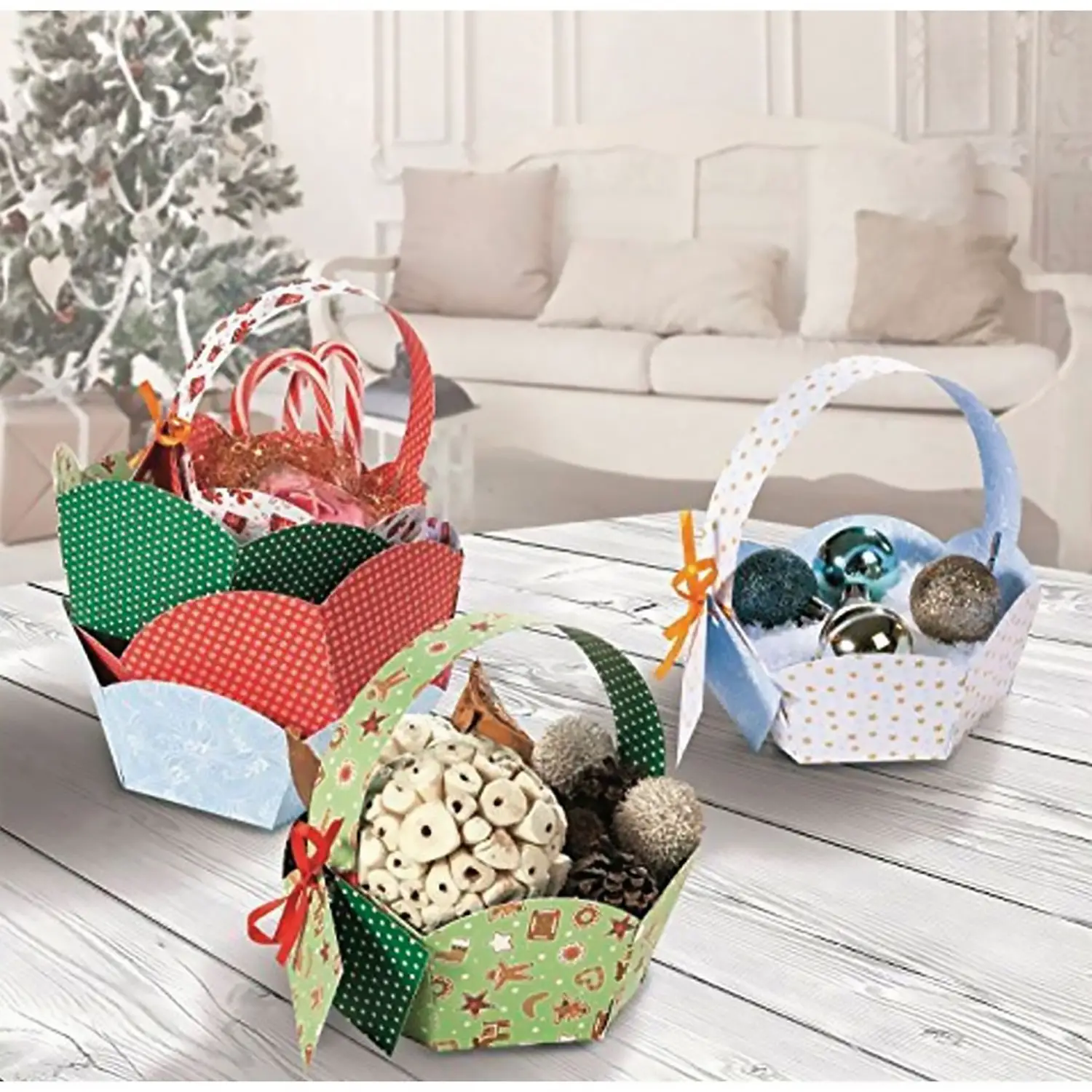 Ogni cestino è realizzato in cartoncino con una fantasia colorata, rendendoli adatti per una varietà di usi. Possono essere utilizzati come contenitori per regali o dolci, come decorazioni per feste o eventi, o come oggetti di artigianato per progetti scolastici o attività domestiche.