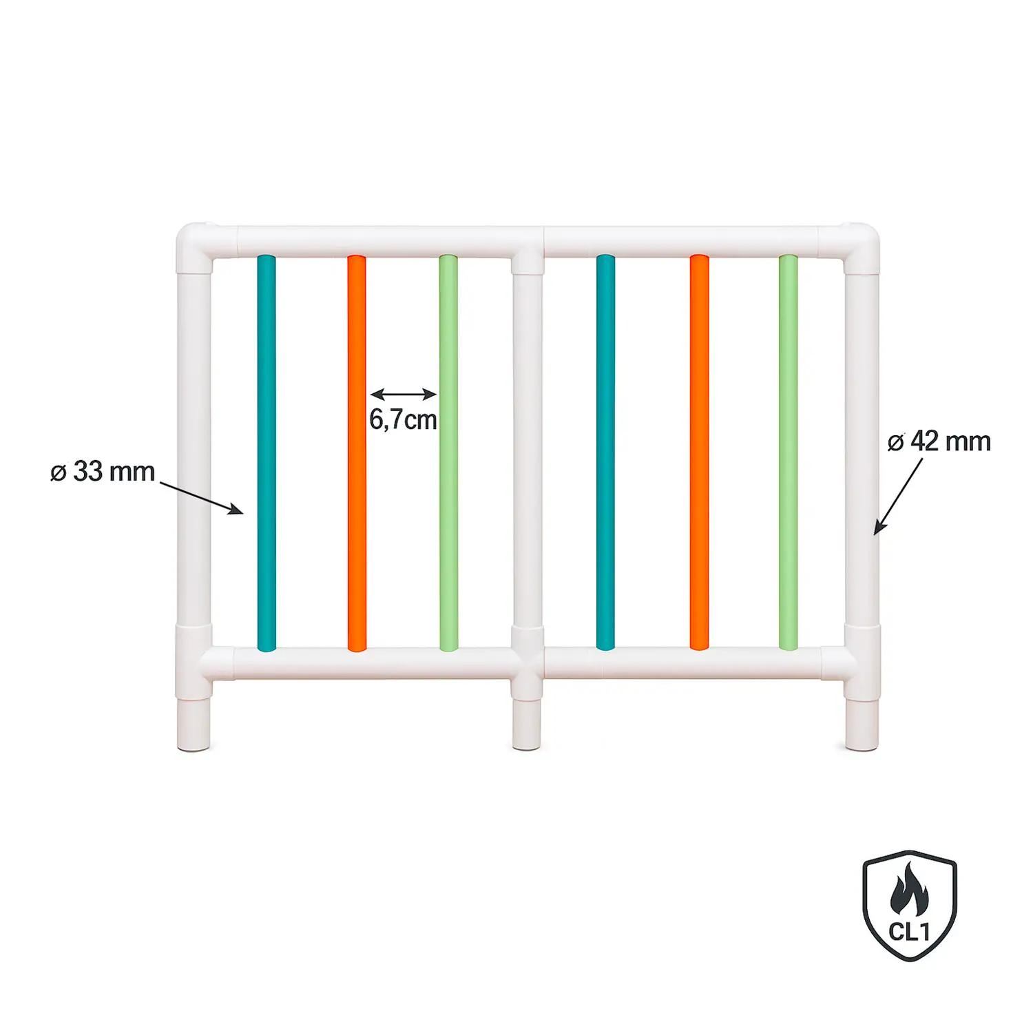 Certificato CL1 reazione al fuoco UNI 9177, conforme al D.lgs 81⁄08 e alle norme EN 71.1, è sicuro, resistente e facile da pulire con detergente neutro. Disponibile con struttura bianca e tubi pastello assortiti, si fissa a muro con fast clips arrotondate apribili solo da adulti, per consentire ispezione e manutenzione.
