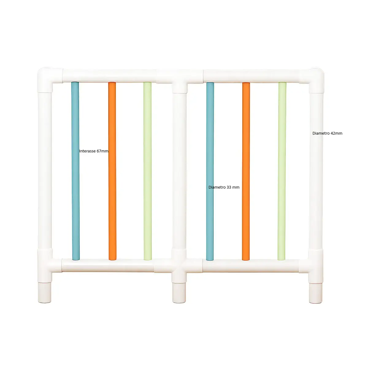 Il copritermosifone Baby Arcobaleno è la soluzione ideale per mettere in sicurezza i termosifoni in ambienti frequentati da bambini come asili nido, scuole dell’infanzia, ludoteche e centri educativi. Realizzato su misura, in PVC antiurto e antischeggia, assicura massima sicurezza grazie alla struttura arrotondata senza spigoli, progettata per proteggere da urti accidentali. Le barre verticali da 33 mm, distanziate tra loro di 6,7 cm, rispettano e migliorano la norma UNI 10809 sull’inattraversabilità e antiscalabilità, mentre i robusti tubolari da 42 mm con piedino garantiscono stabilità e solidità.