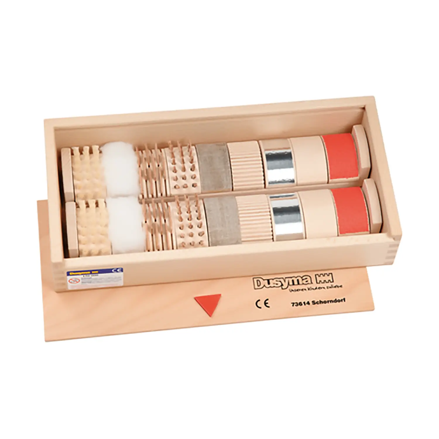 Il Gioco delle Carezze è un’attività sensoriale ed emozionale che permette ai bambini di esplorare materiali diversi e di comunicare attraverso il contatto e l’ascolto reciproco. Ogni elemento “carezza” è dotato di una superficie tattile specifica (come lino grezzo, pelle, gomma goffrata, alluminio…) e viene inserito in una barra a lamelle in legno, progettata per giochi a occhi chiusi e attività di riconoscimento.