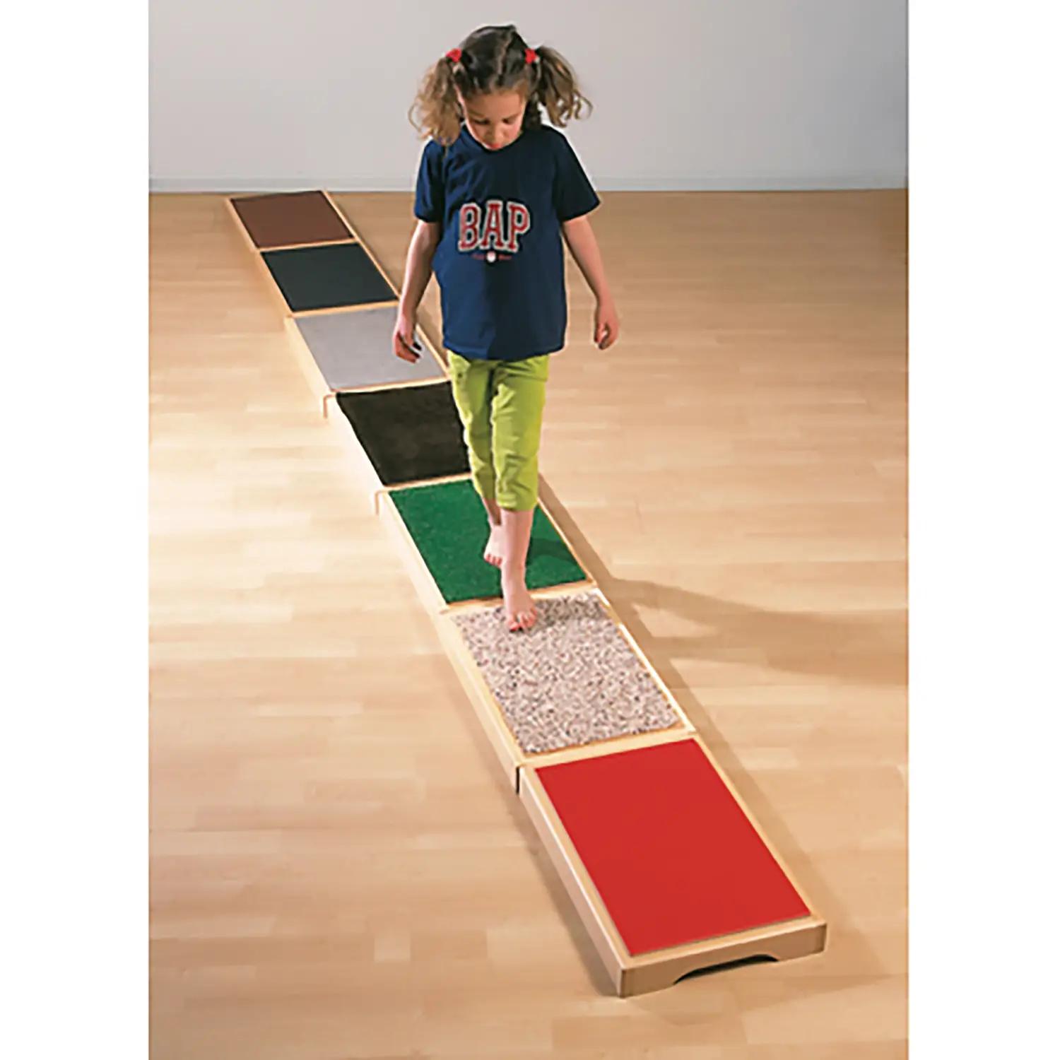 Il Percorso Tattile con Grandi Piattaforme Sensoriali è uno strumento educativo e ludico che stimola il movimento, la percezione corporea e l’esplorazione sensoriale nei bambini. Composto da sette pannelli in legno, ciascuno rivestito con un materiale diverso, il percorso offre un’esperienza ricca di stimoli tattili e termici attraverso il contatto diretto con i piedi nudi.