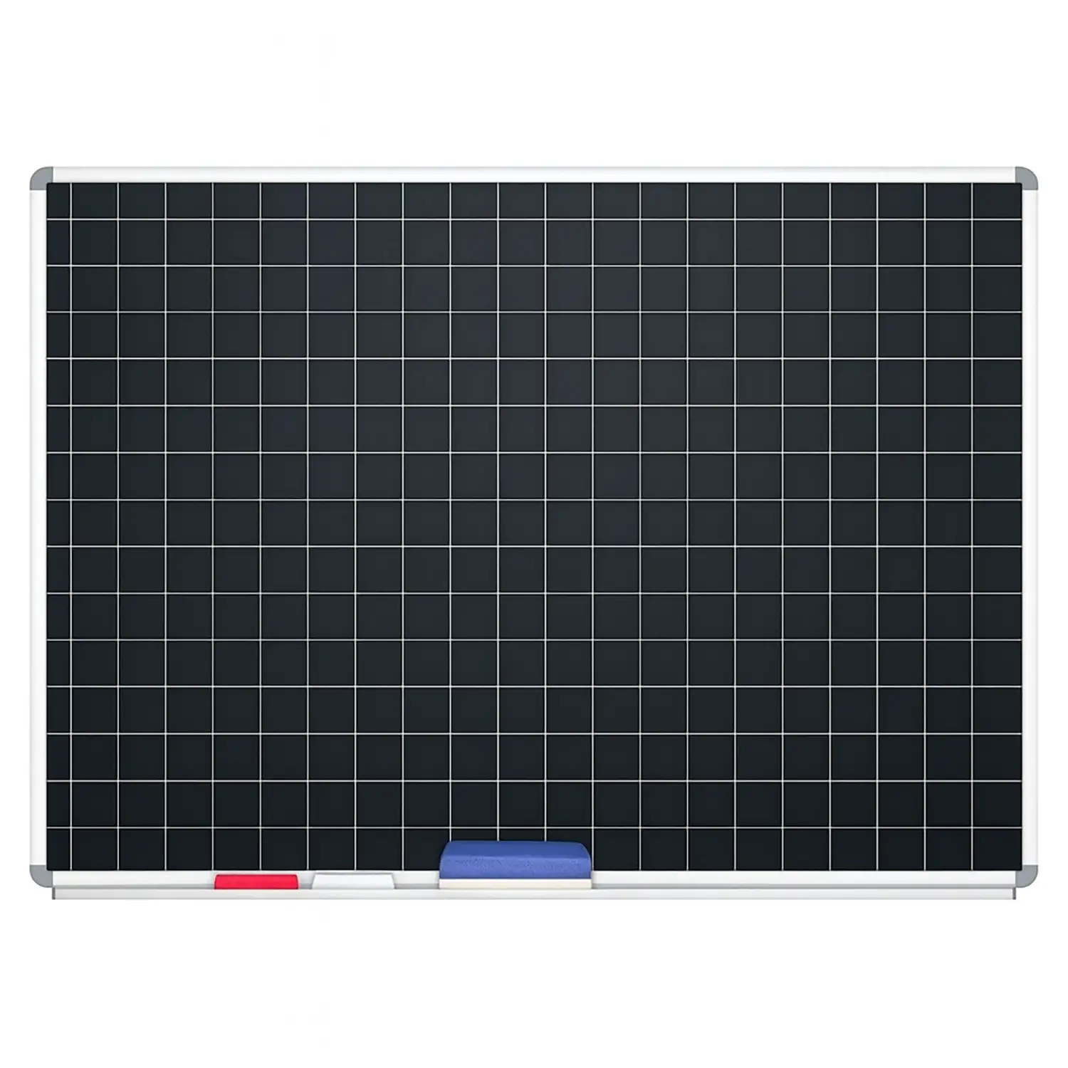 La lavagna magnetica presenta una superficie grigio ardesia quadrettata 5x5 cm, ideale per grafici e disegni precisi con gessi colorati.