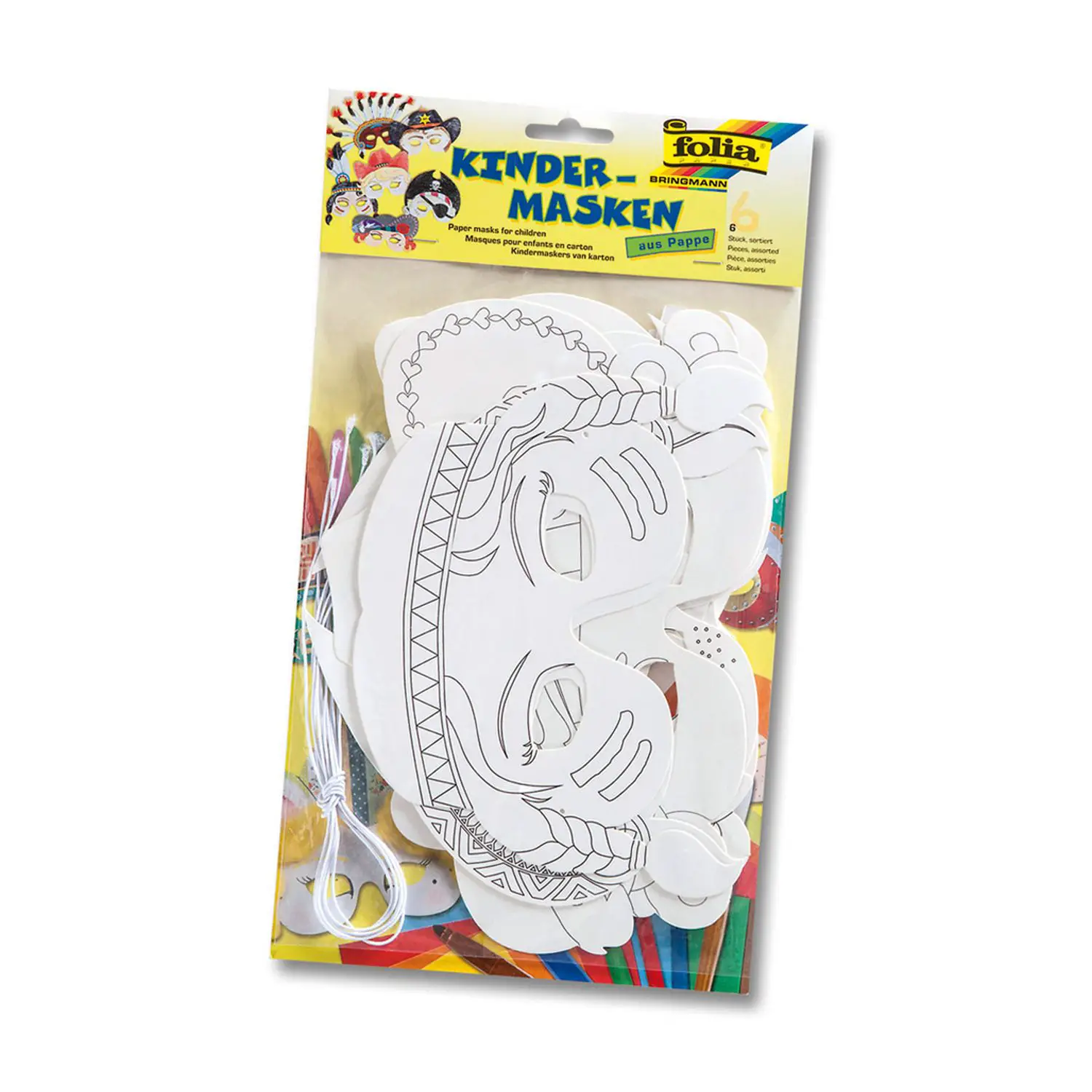 - ✅ Set di 6 maschere in cartoncino bianco con diverse sagome: cowboy, sceriffo, pirata, indiano, dama e squaw.