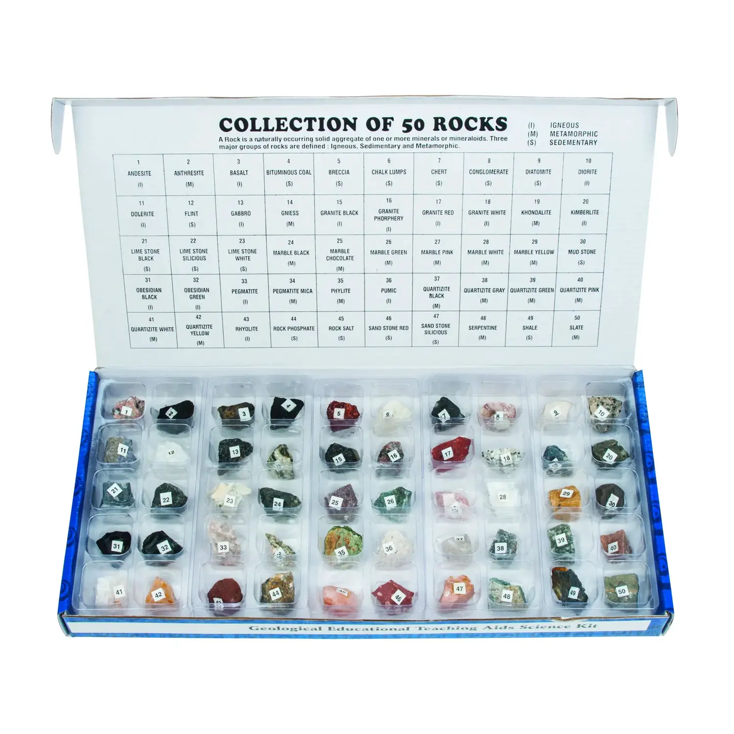 Tipologia di Rocce Incluse: Questa collezione comprende 50 campioni diversi di rocce, che rappresentano i tre principali gruppi: magmatiche, sedimentarie e metamorfiche.