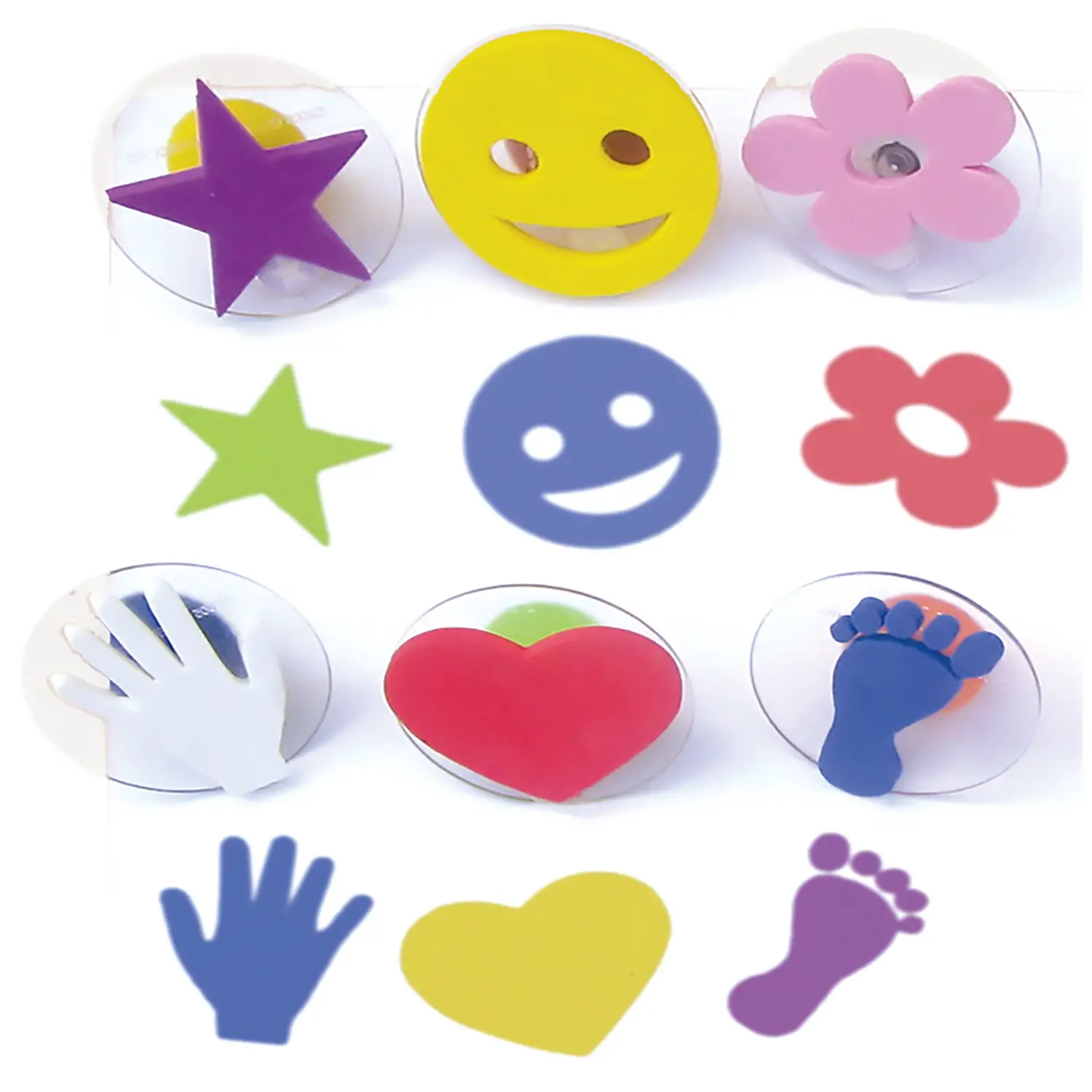 Timbri con grande impugnatura ideale per le piccole mani dei bambini e supporto in plastica trasparente per consentire il preciso posizionamento sulla superficie da decorare.