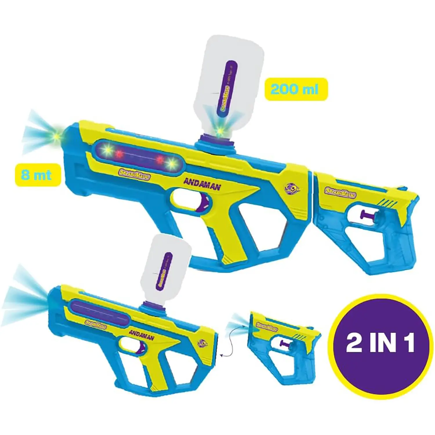Spara acqua 2 in 1 con doppia modalità di utilizzo. La prima è una pistola elettrica con potenza di lancio continua e controllata, grazie alla tecnologia avanzata. La seconda è una pistola ad acqua tradizionale, perfetta per continuare il gioco anche dopo aver separato l’accessorio principale.