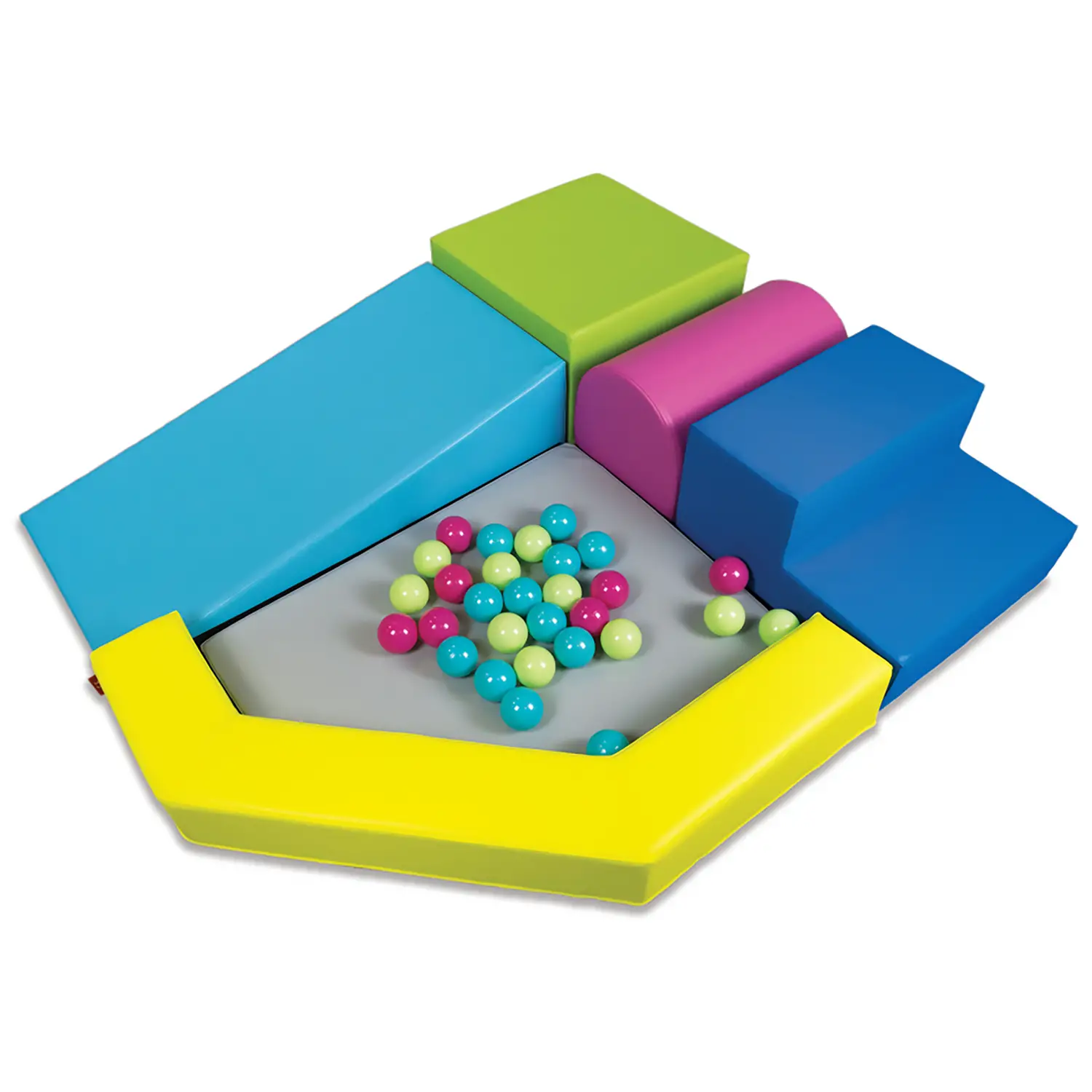 Realizzati in materiali di alta qualità, questi elementi sono resistenti e lavabili. Inoltre, il rivestimento in telo plastico atossico e privo di ftalati rende questi elementi sicuri per i bambini. La superficie antiscivolo garantisce una maggiore stabilità durante il gioco, mentre la piscina centrale, che può essere riempita con palline (non incluse), aggiunge un tocco di divertimento in più.