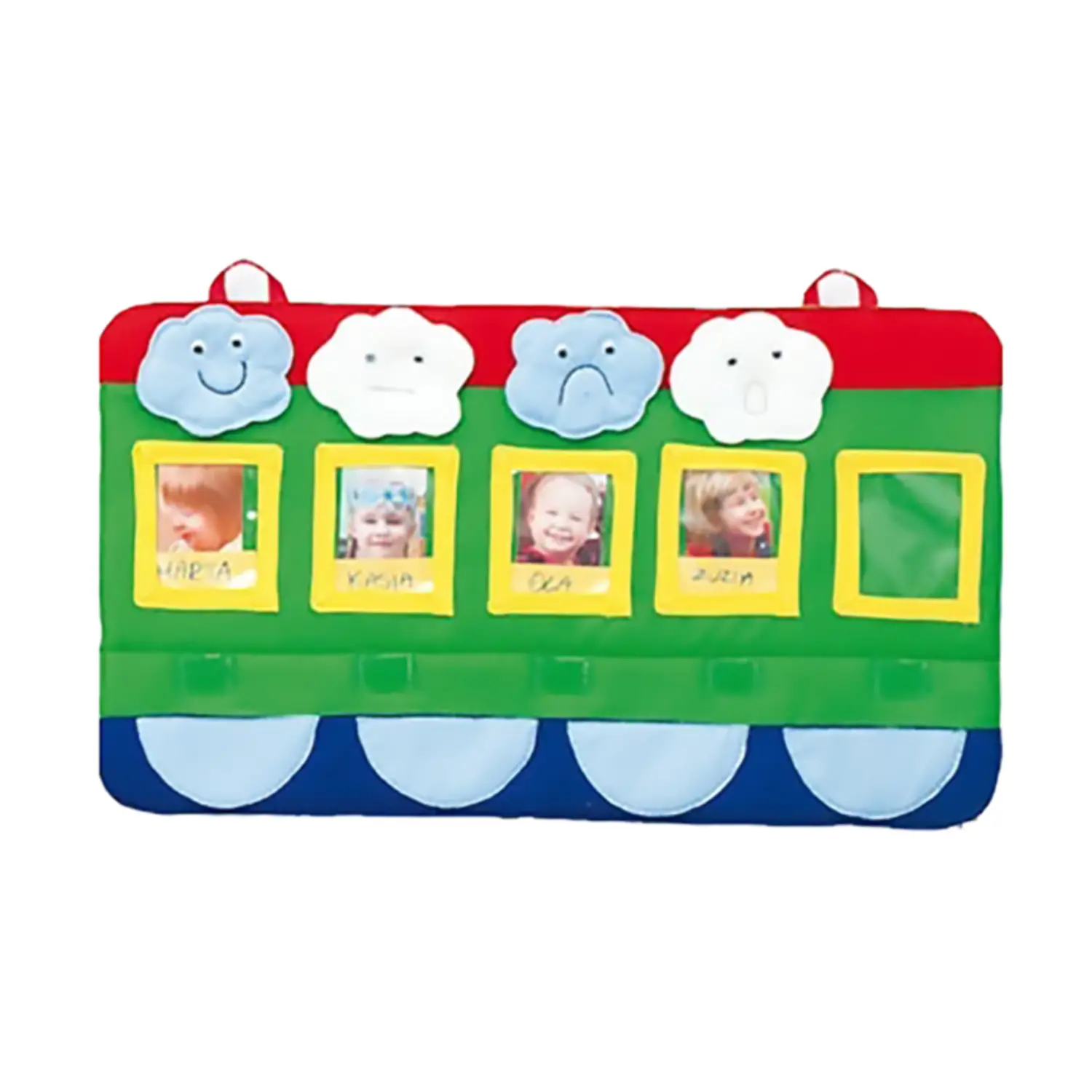 Accogliente e Pratico: Realizzato in tessuto morbido e accogliente, questo vagone è progettato per ospitare fino a 5 foto dei bambini, rendendo semplice e visuale la verifica delle presenze giornaliere.