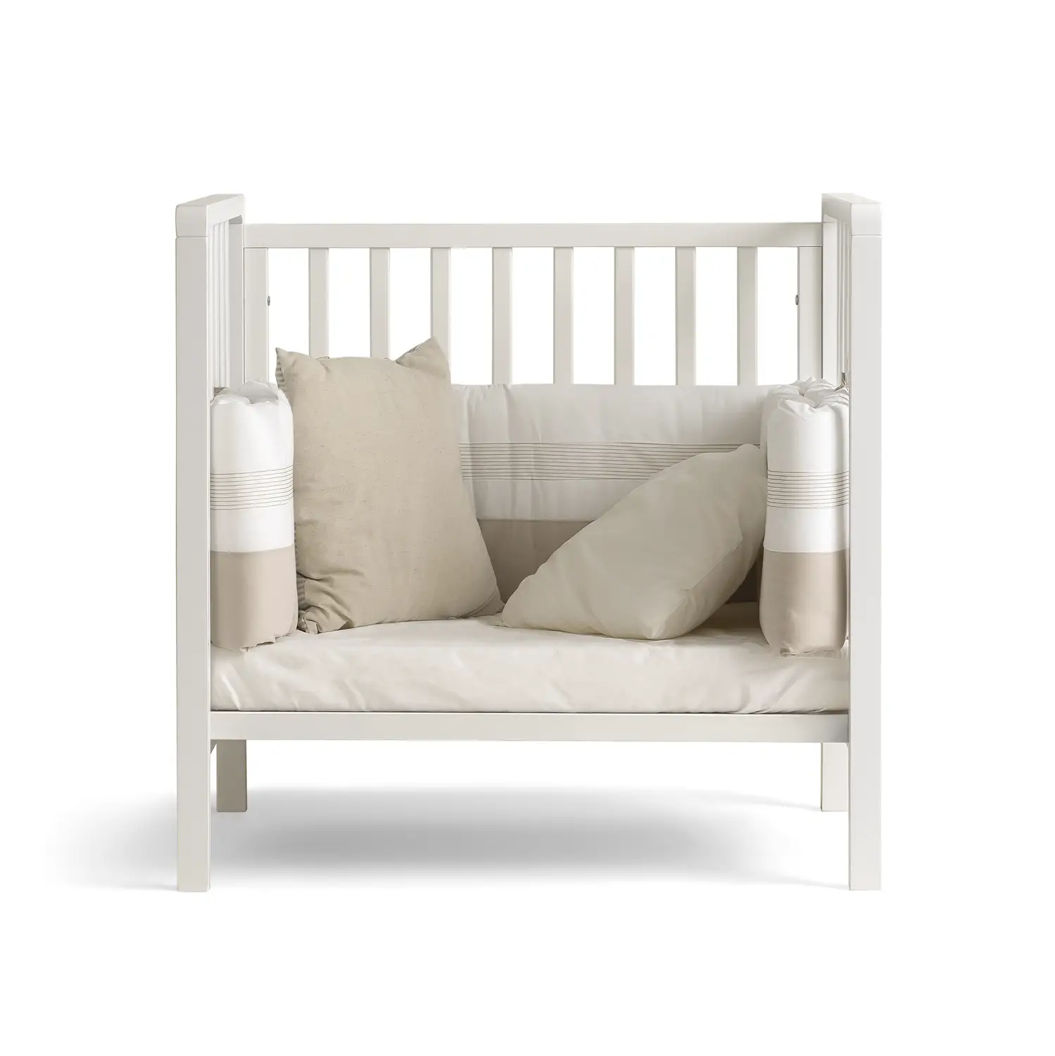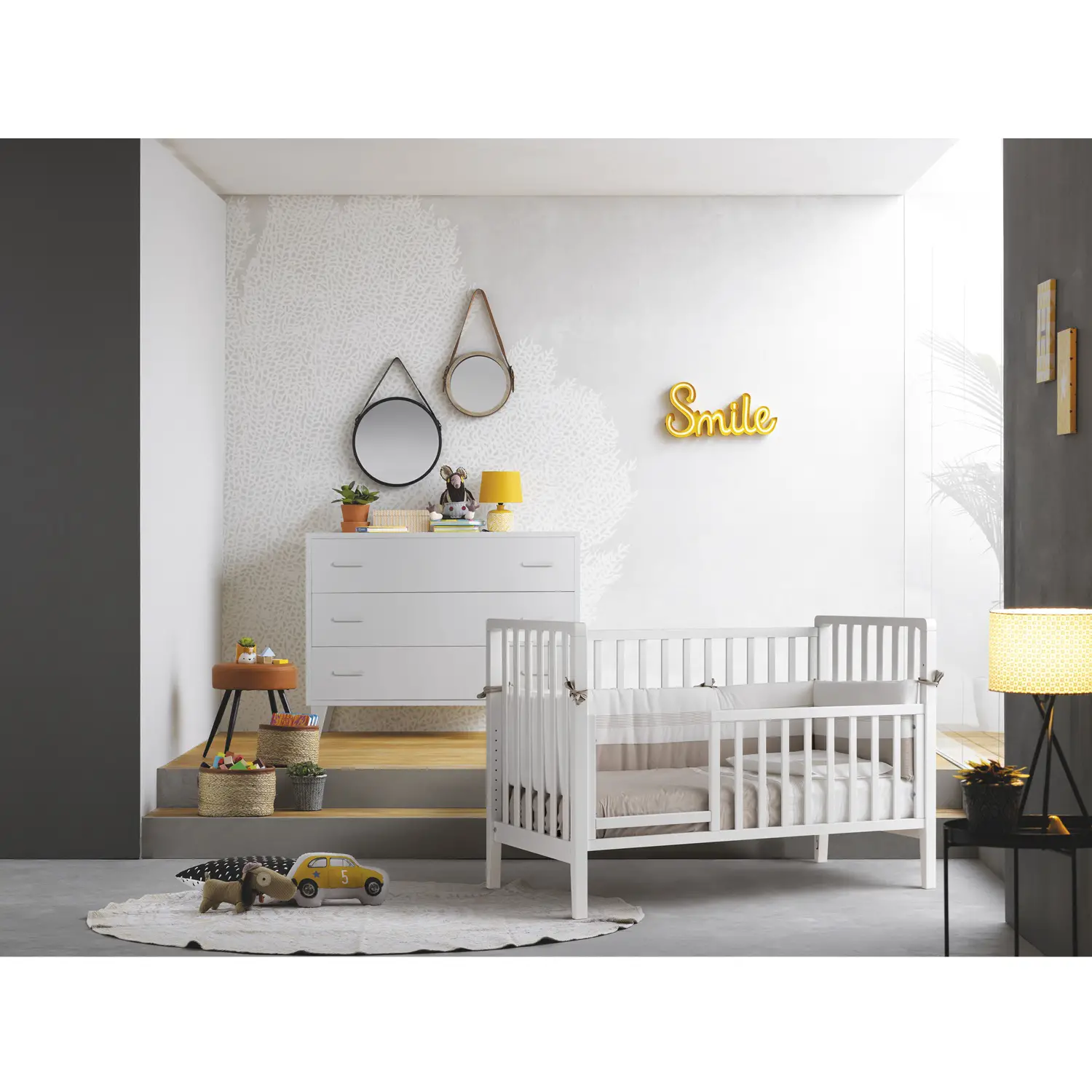 1Culla con sponda mobile – Ideale per i primi mesi, con rete regolabile in più posizioni e quattro maxi ruote gommate per un facile spostamento. 2Lettino tradizionale – Si trasforma in un lettino classico, perfetto per accompagnare il bambino nella crescita. 3Lettino montessoriano – Con l’aggiunta della minisponda (venduta separatamente), diventa un lettino basso, ispirato al metodo Montessori per favorire l’autonomia del bambino. 4Culla fianco letto – Regolabile in altezza e dotata di cinghie di aggancio, consente di dormire accanto al bambino in sicurezza e comodità. 5Divanetto – Rimuovendo la sponda, si trasforma in un accogliente divanetto per la cameretta. 6Poltroncina angolo lettura – Ideale per creare un angolo relax accogliente per il bambino o i genitori.