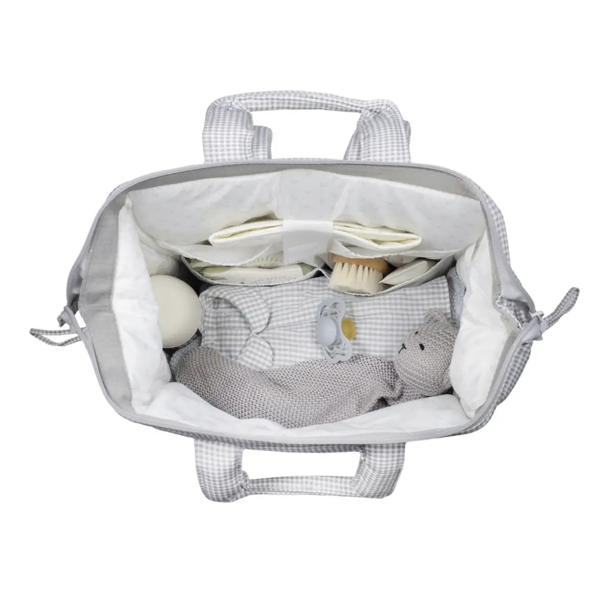 Materiale 100% cotone resistente e idrorepellente Realizzato in cotone 100% con trattamento water resistant, protegge il contenuto da umidità e piccoli imprevisti. Resistente e durevole, è pensato per accompagnare le famiglie nella routine quotidiana mantenendo un aspetto elegante e curato.