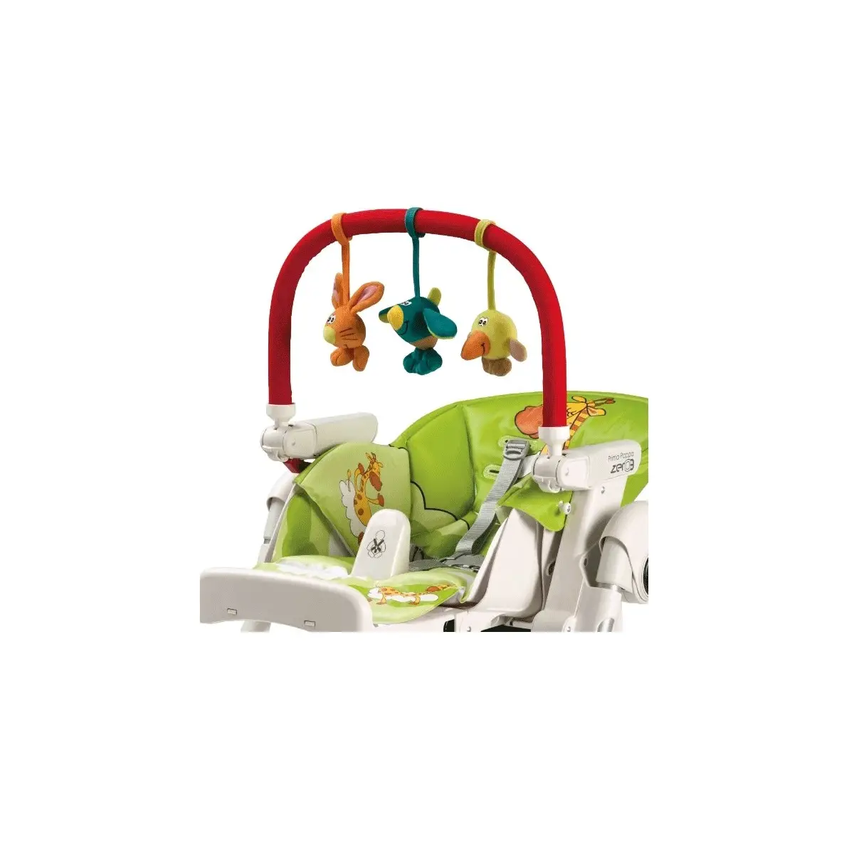 Simpatica barra gioco con tre pupazzetti colorati, adatta ai seggioloni Peg Perego.