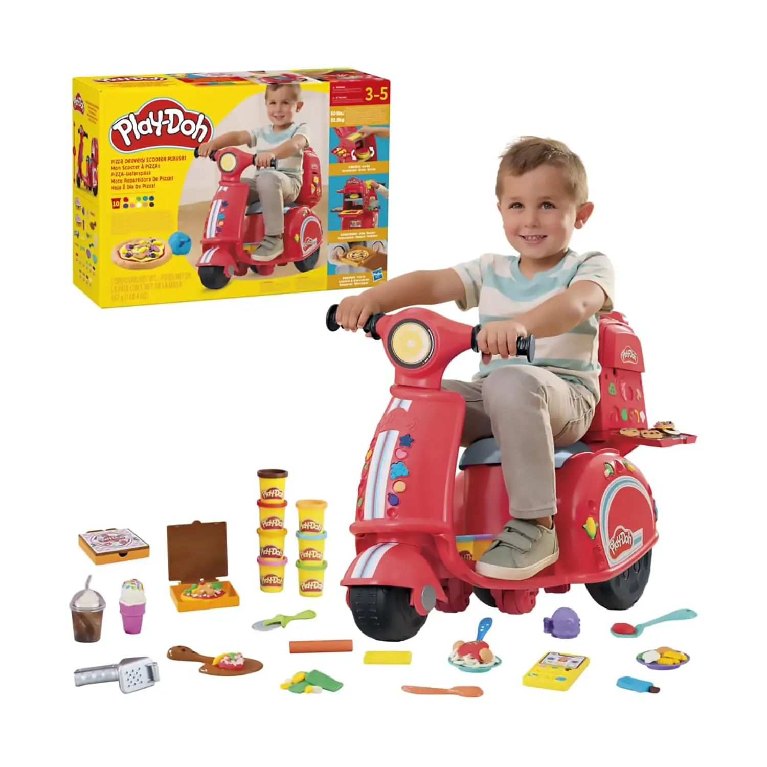 - ✅ Scooter giocattolo Play-Doh con accessori per simulare la consegna e la preparazione di pizze creative.