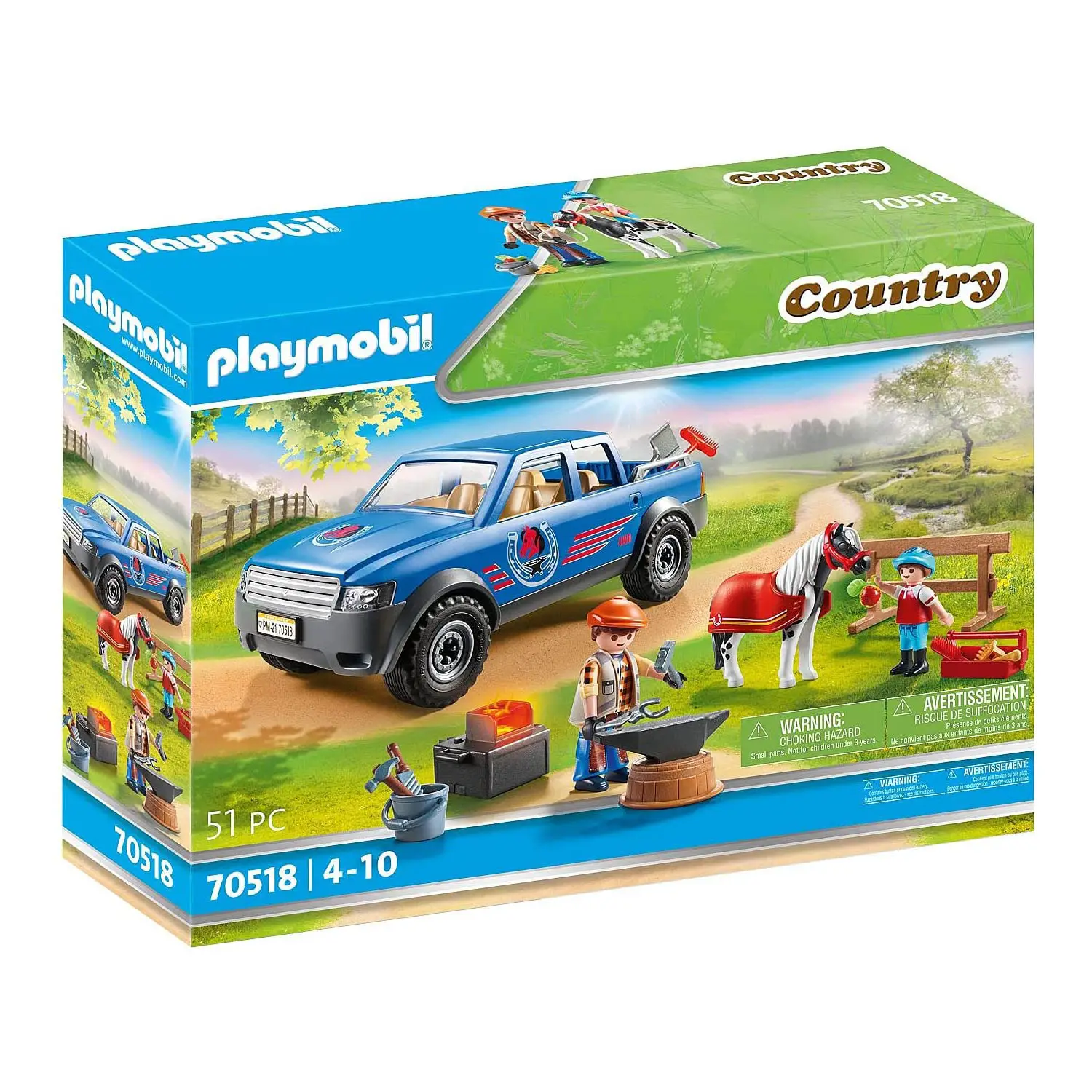 Le vacanze a cavallo sono il sogno di molti bambini. C’è sempre così tanto da fare nella fattoria dei pony! Il maniscalco arriva alla fattoria a bordo del suo pick-up blu, sul quale ha caricato tutti i suoi strumenti: incudine, fucina, pinze, martello, lima e pala. Controlla ogni giorno abilmente gli zoccoli dei pony, e poi accende il fuoco per ferrare i cavalli. Alla fine della giornata, tutti i pony sono dotati di nuovi ferri. Il playset include un personaggio PLAYMOBIL, un pony, un pick-up con gancio di traino, una fucina mobile con maniglie per il trasporto, incudine, martello, pinze con ferri di cavallo, pala e molti altri accessori. La brace della fucina si accende tramite un pulsante laterale e si spegne automaticamente dopo 90 secondi.