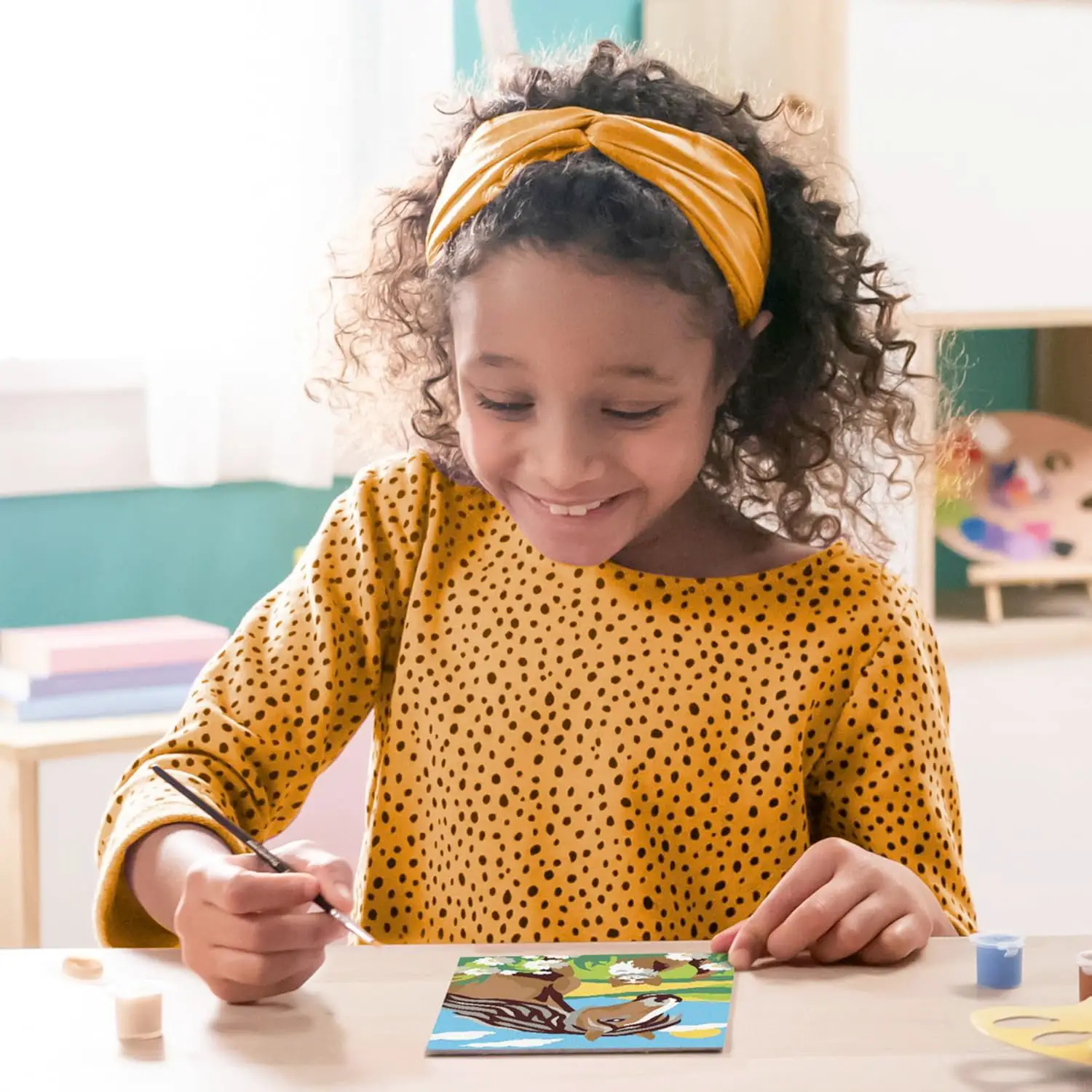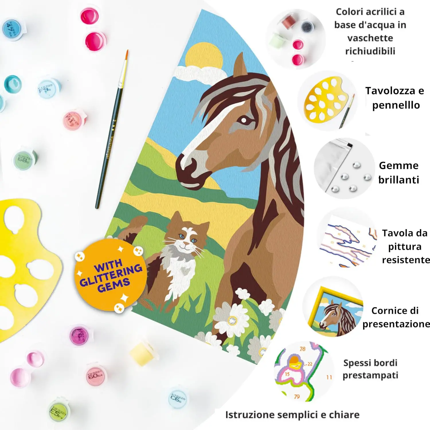Set completo e materiali sicuri - Il kit include una tela numerata, colori acrilici atossici e pennello. Tutto pensato per bambini, con materiali testati e adatti a mani piccole e creative.