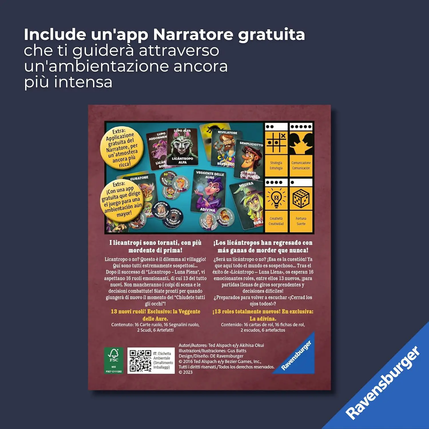 Espansione Avvincente e Compatibile - Espansione giocabile singolarmente o combinabile con Licantropo Luna Piena. Aggiunge carte inedite e nuove meccaniche per arricchire l’esperienza e mantenere il gioco sempre imprevedibile.