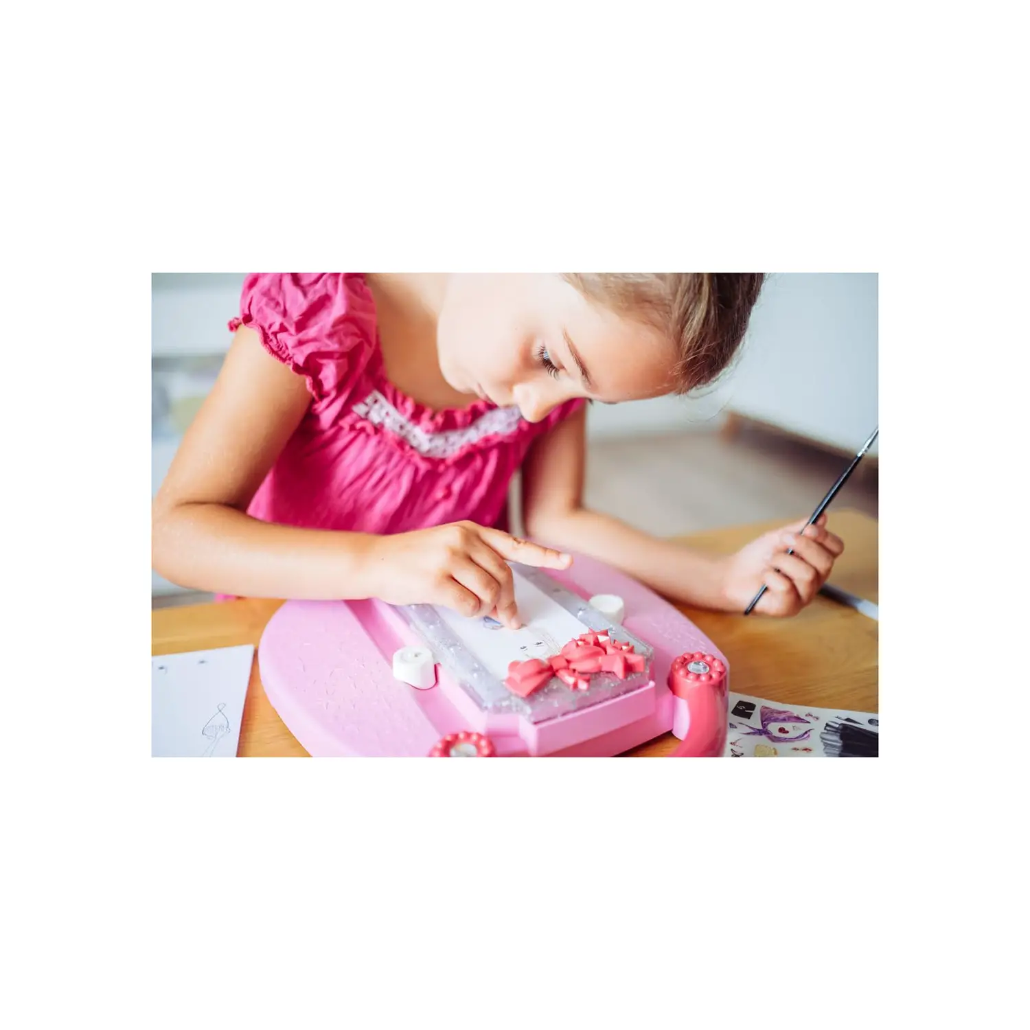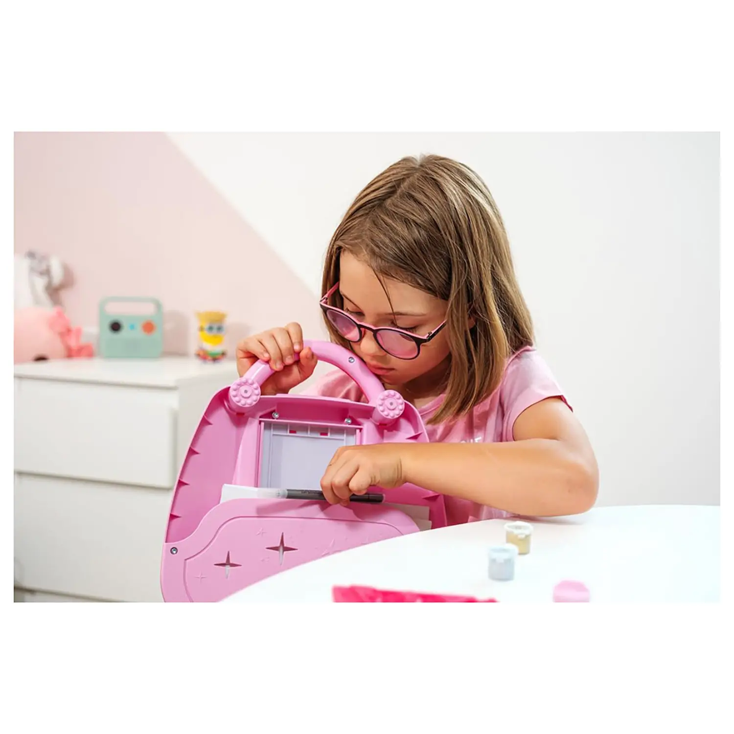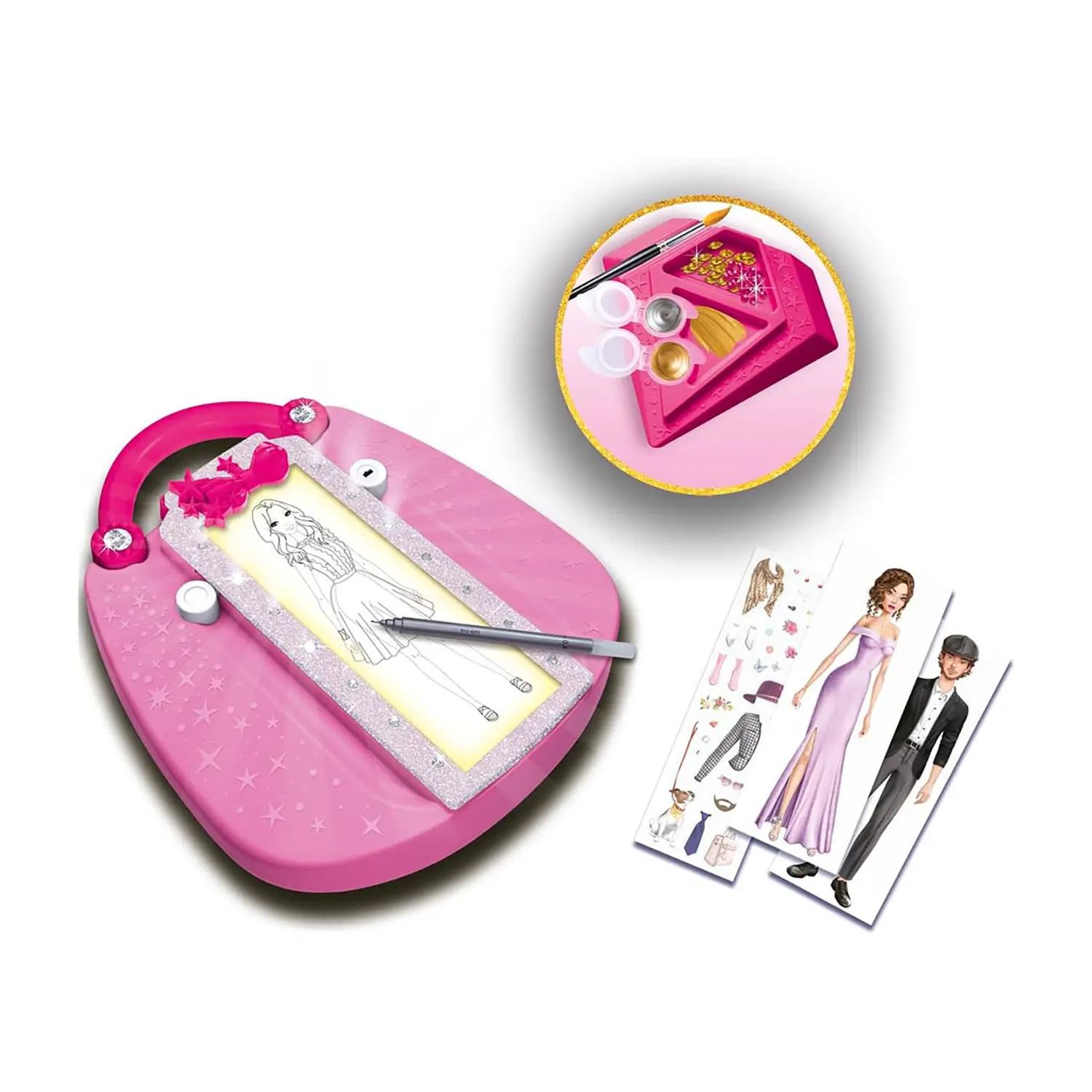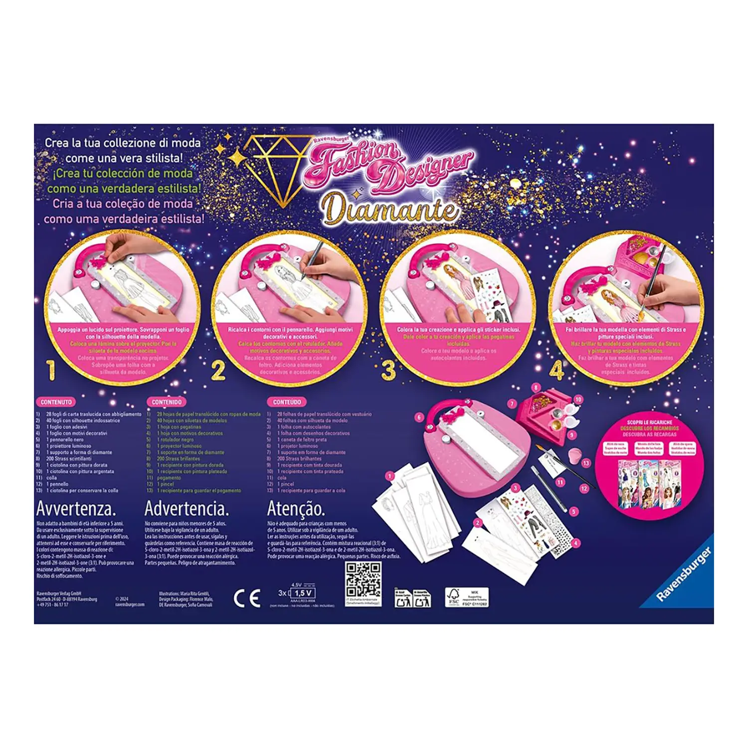 Contenuto della confezione: - 1 proiettore luminoso - 200 strass scintillanti - 1 ciotolina con pittura dorata - 1 ciotolina con pittura argentata - 28 fogli traslucidi con outfit moda, accessori e motivi decorativi - 40 fogli “silhouette” - 1 foglio con adesivi - 1 pennarello nero - 1 supporto per disegnare - 2 mollette - Colla - 1 pennello - 1 ciotolina per conservare la colla - Istruzioni