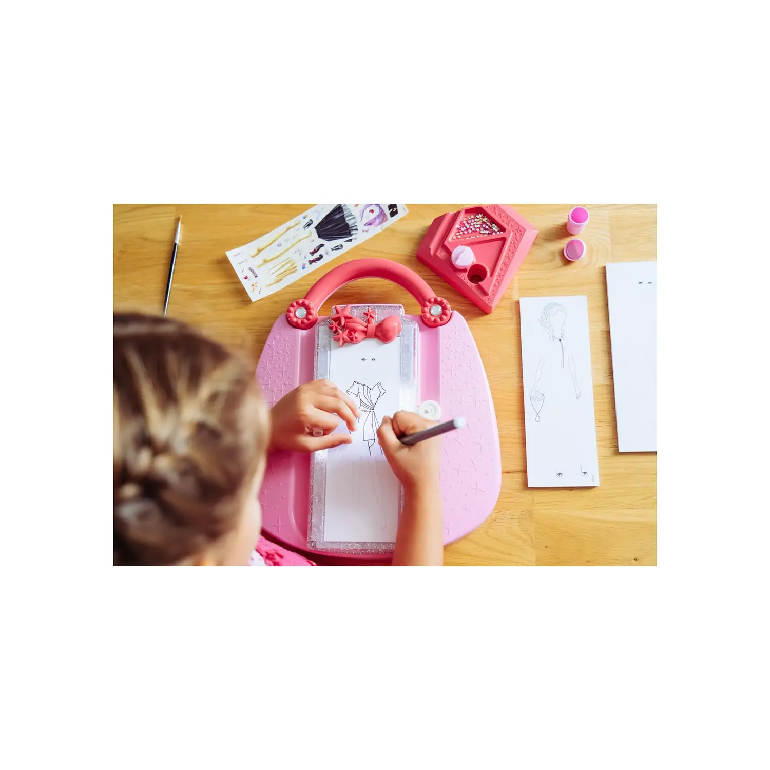 Vantaggi del prodotto: - Creatività senza limiti: Oltre 500 combinazioni di outfit - Personalizzazione: Aggiungi strass, etichette adesive e colori sgargianti - Portatile: Tavolo luminoso portatile per disegnare ovunque - Sicuro: 2 pinze per fermare i fogli durante il disegno