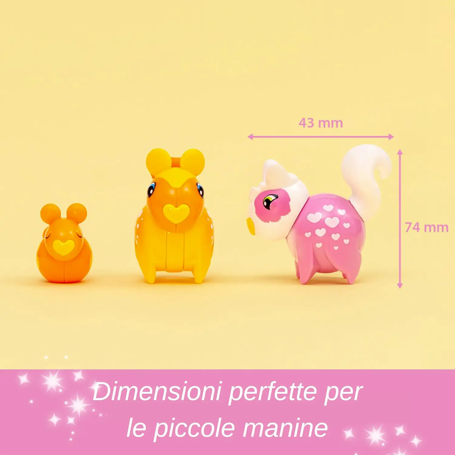 Personaggi Magnetici e Colorati: Include tre personaggi unici — Camelia, Dahlia e Carrot — con design vivaci, magneti nascosti e corpi snodati per interazioni dinamiche. Gli accessori divertenti rendono ogni storia più realistica e coinvolgente.
