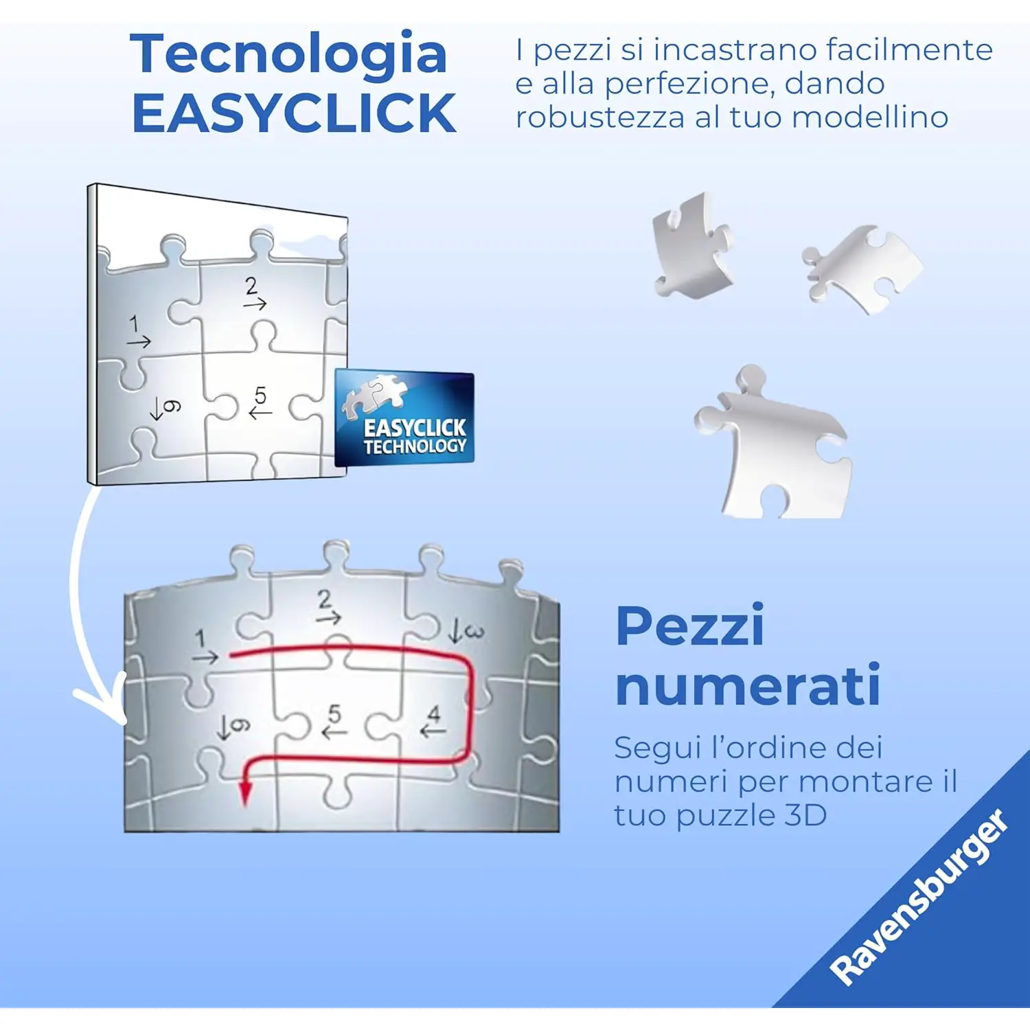 Linea Ravensburger certificata Made in Europe Questo articolo fa parte della collezione Ravensburger Puzzle 3D, realizzata interamente in Europa. Include istruzioni illustrate per un montaggio facile e guidato, rendendolo perfetto anche come prima esperienza di puzzle tridimensionale.