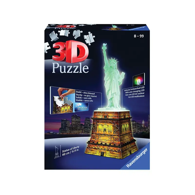Il Puzzle 3D Statua della Libertà Night Edition di Ravensburger è una fantastica riproduzione in 3D del celebre monumento americano. Questa edizione speciale presenta un effetto notturno che illumina la costruzione con bellissimi colori scintillanti grazie alla luce LED posizionata sulla base.
