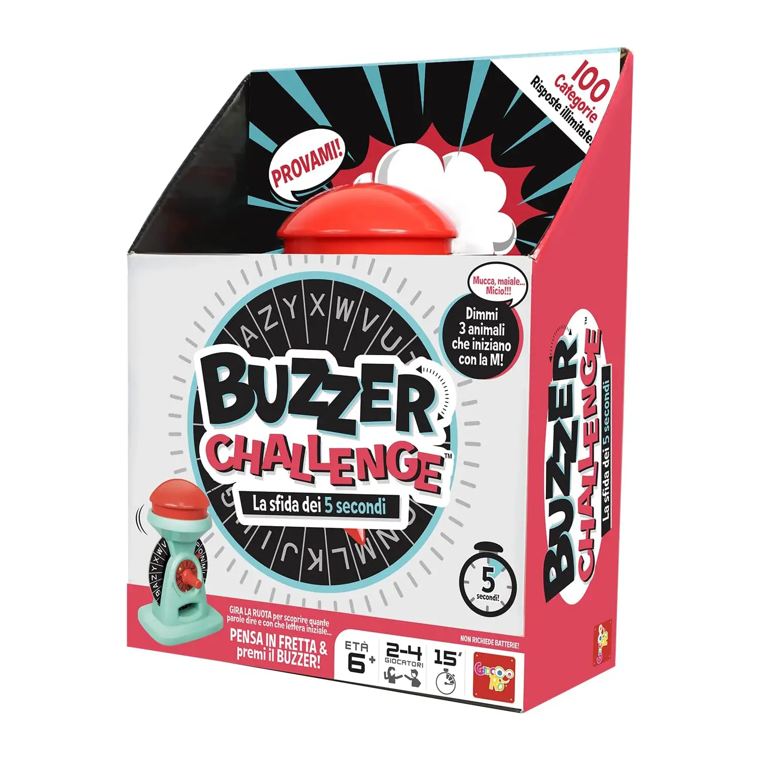- Contenuto: buzzer interattivo, carte categoria, istruzioni complete