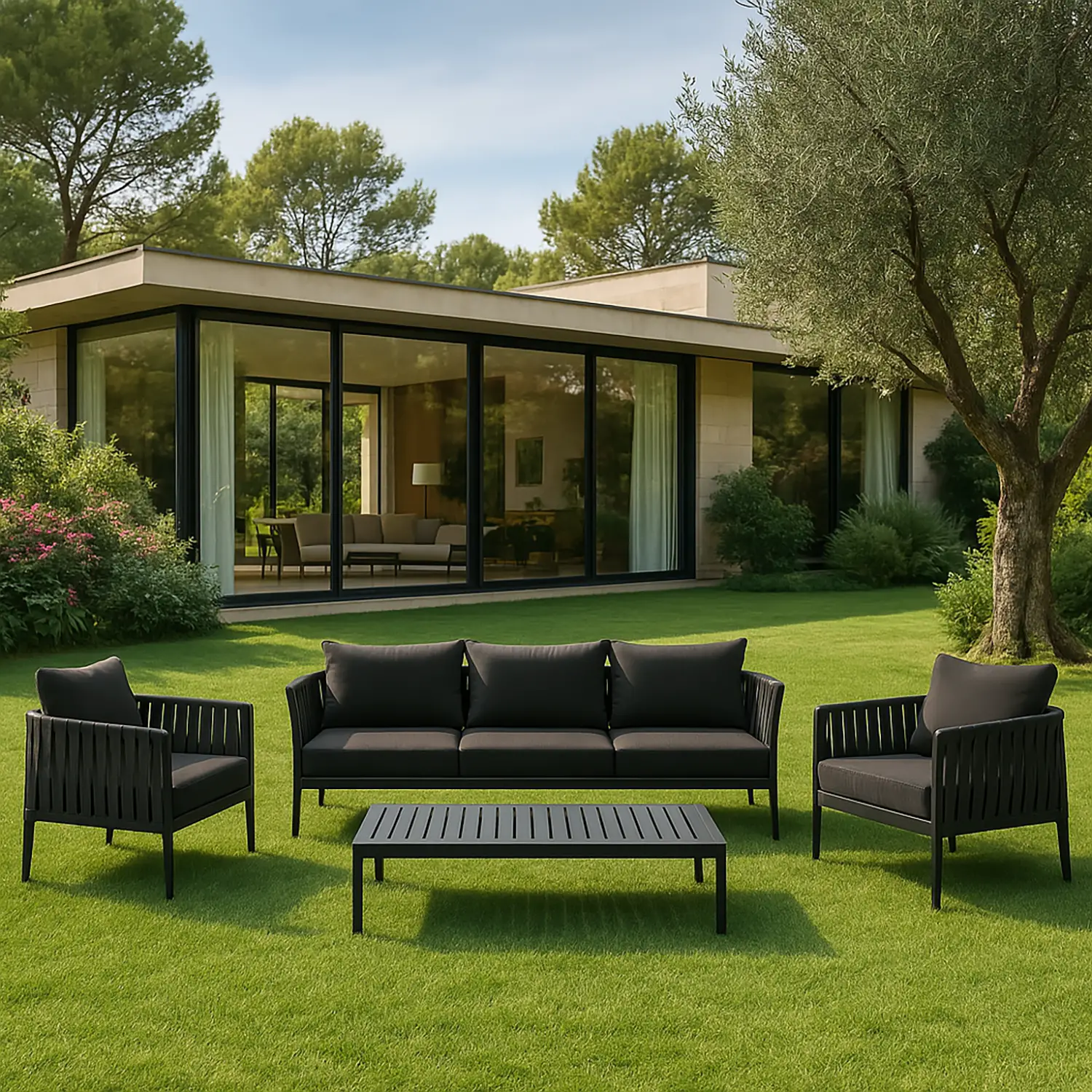 Struttura robusta in alluminio – Verniciato a polvere epossidica, perfetto per l’uso esterno. Cuscineria idrorepellente in Olefin – Resistente all’acqua e facile da mantenere. Tavolino coordinato – Realizzato in alluminio con piano a doghe, per un design elegante e funzionale. Ampie sedute e comfort ottimale – Il divano a tre posti e le poltrone offrono spazio e comodità per i tuoi momenti di relax. Facile da assemblare – Include istruzioni dettagliate per un montaggio veloce.