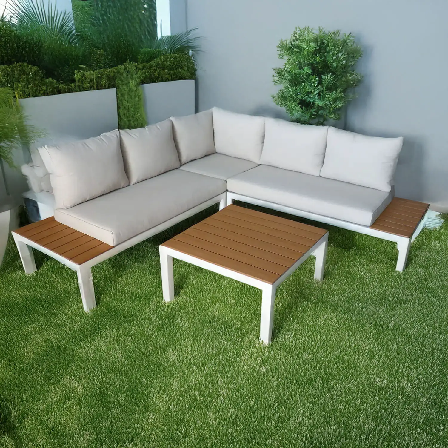 - ✅ Set da giardino angolare da 5-6 posti con struttura in alluminio bianco verniciato a polvere, resistente e leggero.