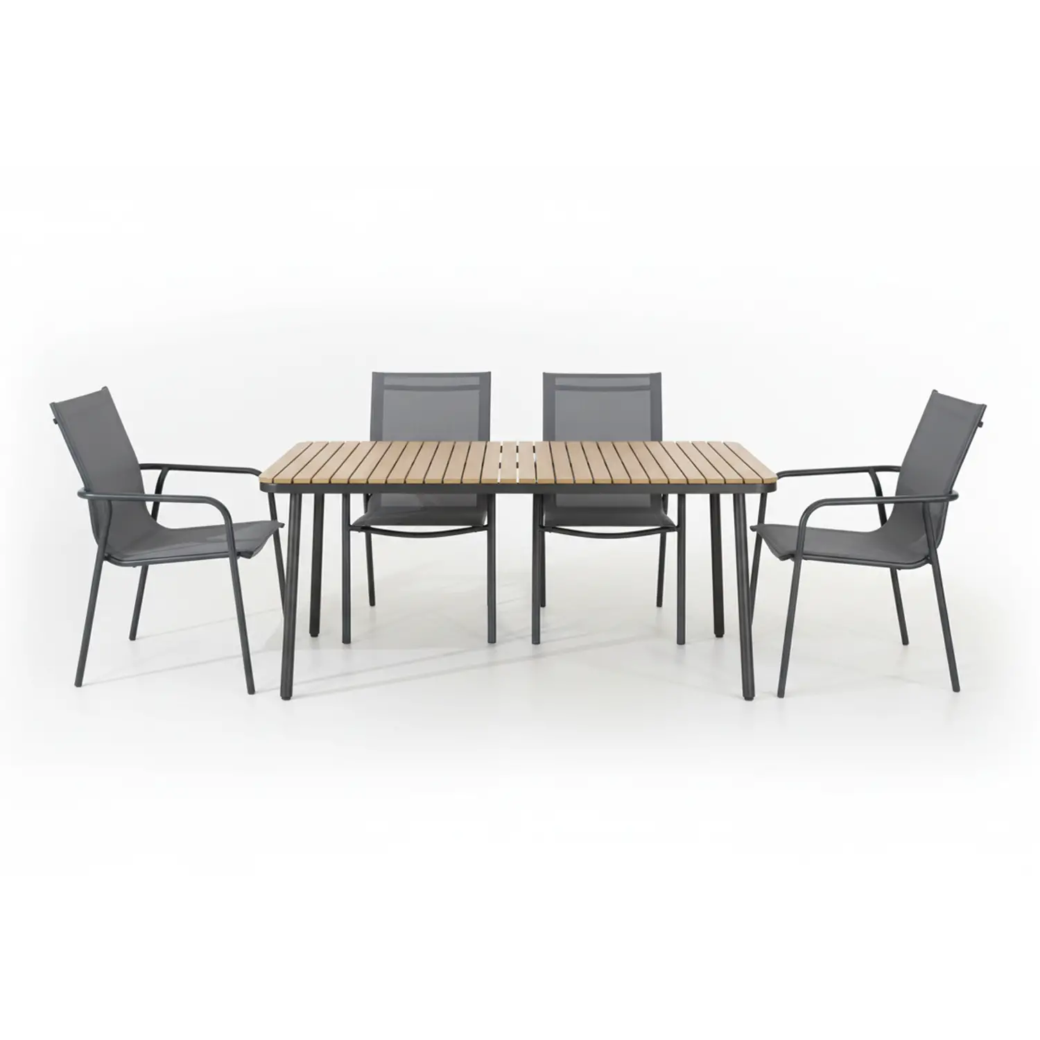 Materiali resistenti per uso esterno Realizzato con materiali selezionati, il set combina ferro verniciato e polywood per garantire durabilità e facilità di manutenzione. Il Textilene assicura resistenza a sole e umidità, mantenendo comfort e praticità nel tempo.
