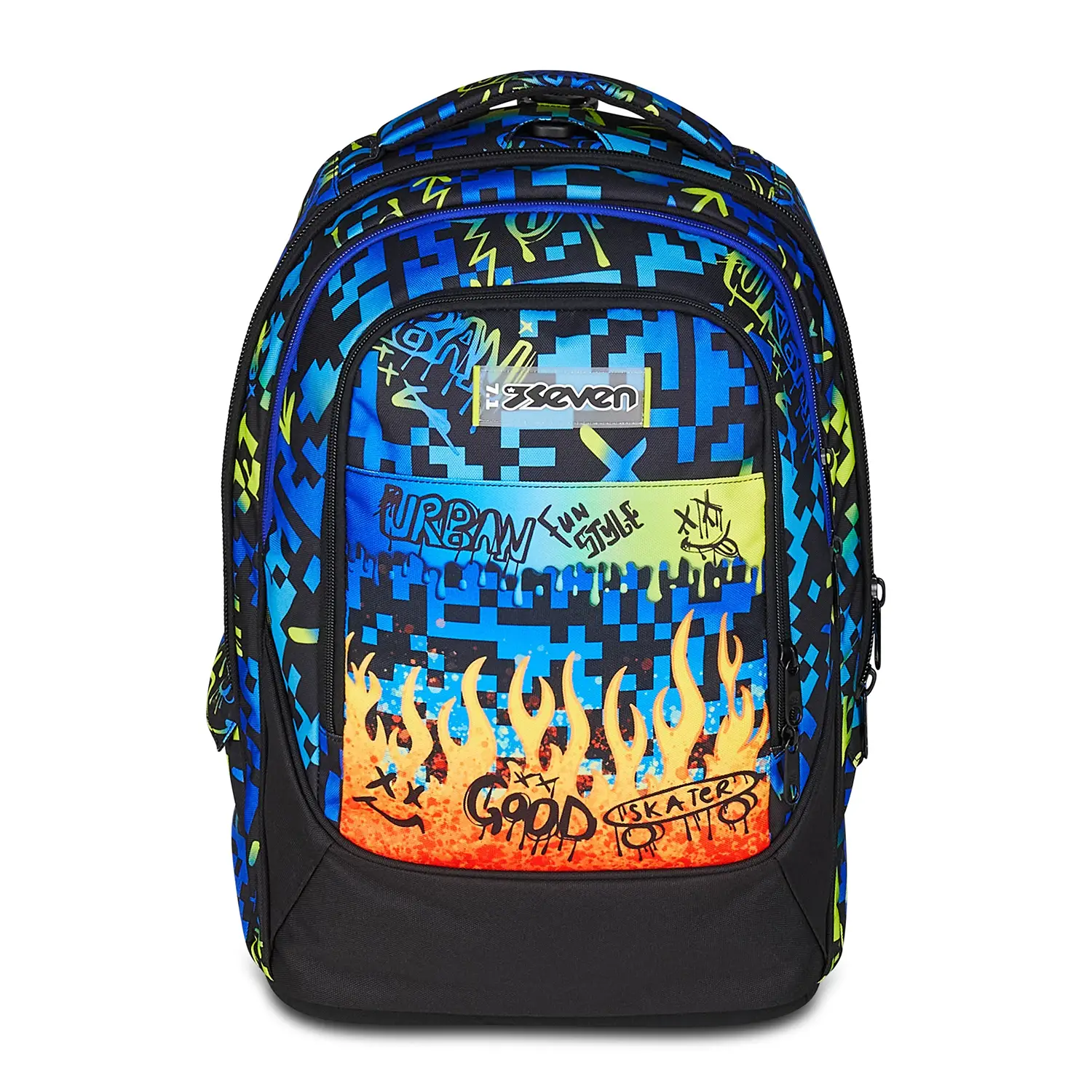 Trolley Tyre Seven®: il maxi zaino per ogni avventura Lo zaino scuola con trolley Tyre Scribbled Flame è pensato per chi cerca spazio, robustezza e stile. Con maxi ruote da 17 cm, affronta ogni terreno con facilità e sicurezza.