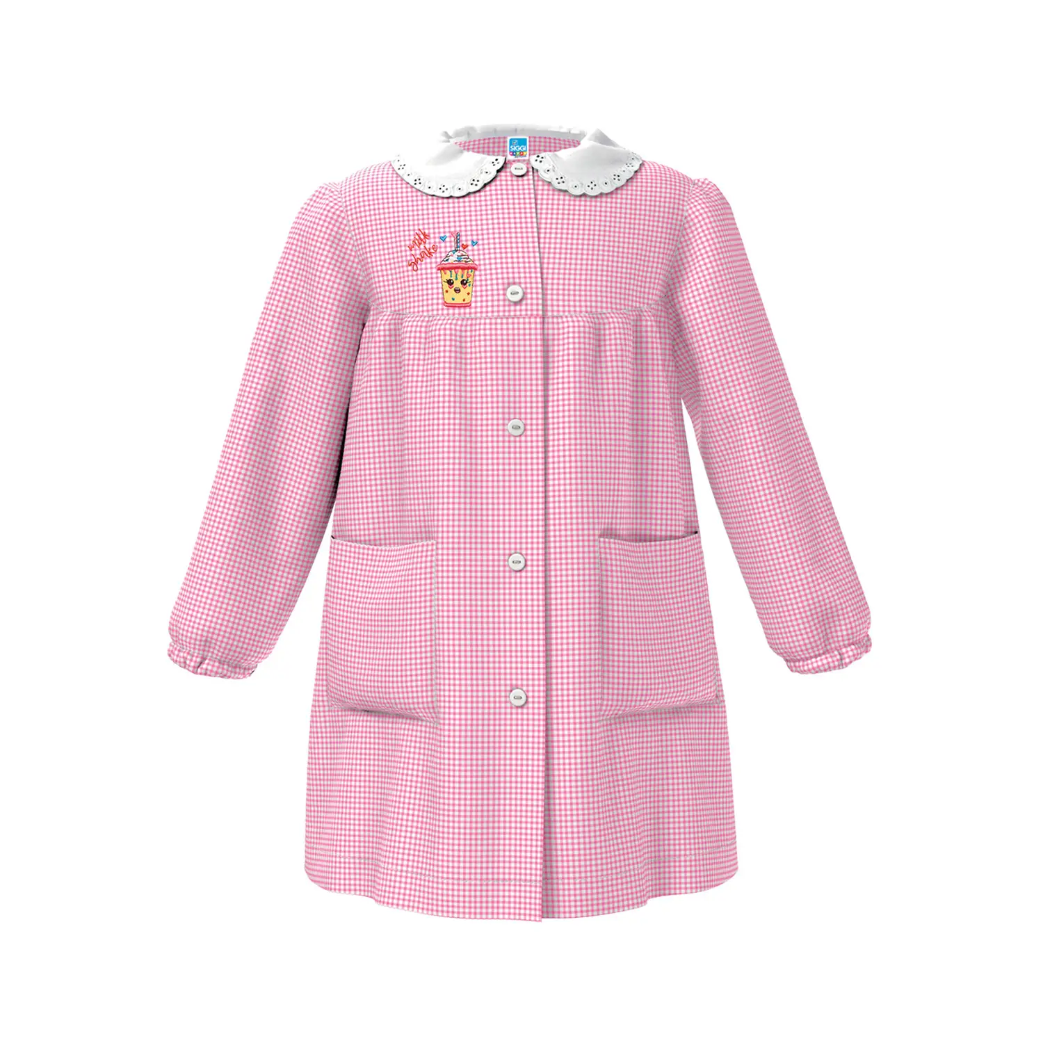 Design allegro per la scuola dell’infanzia Il grembiule Milk Shake quadrettato rosa è perfetto per bambine di 5 anni che frequentano l’asilo, con un look vivace e dettagli curati che conquistano a prima vista.