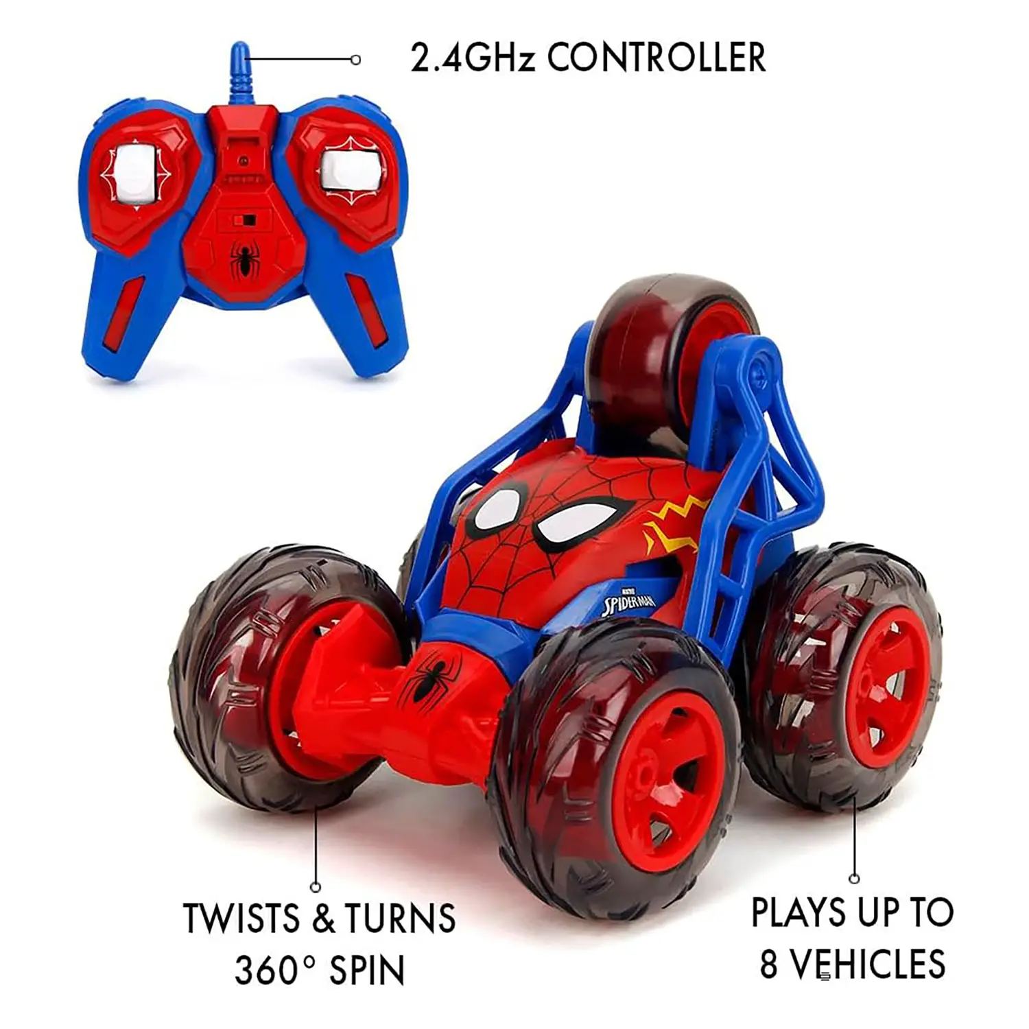 Divertimento acrobatico con Spider-Man: l’auto radiocomandata Spider-Man Stunt permette di eseguire acrobazie incredibili, tra cui rotazioni a 360° e rollover delle ruote anteriori, per un’azione senza limiti!