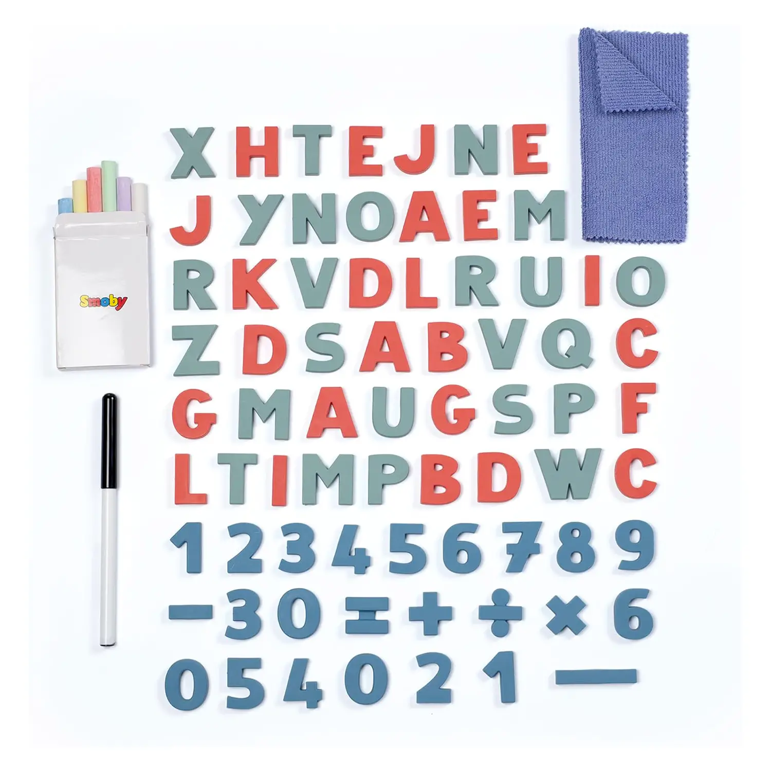 Set ricco di accessori inclusi - La confezione comprende 72 lettere e numeri magnetici, gessetti colorati, pennarello lavabile e panno per la pulizia.