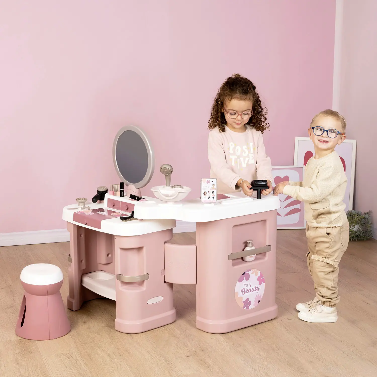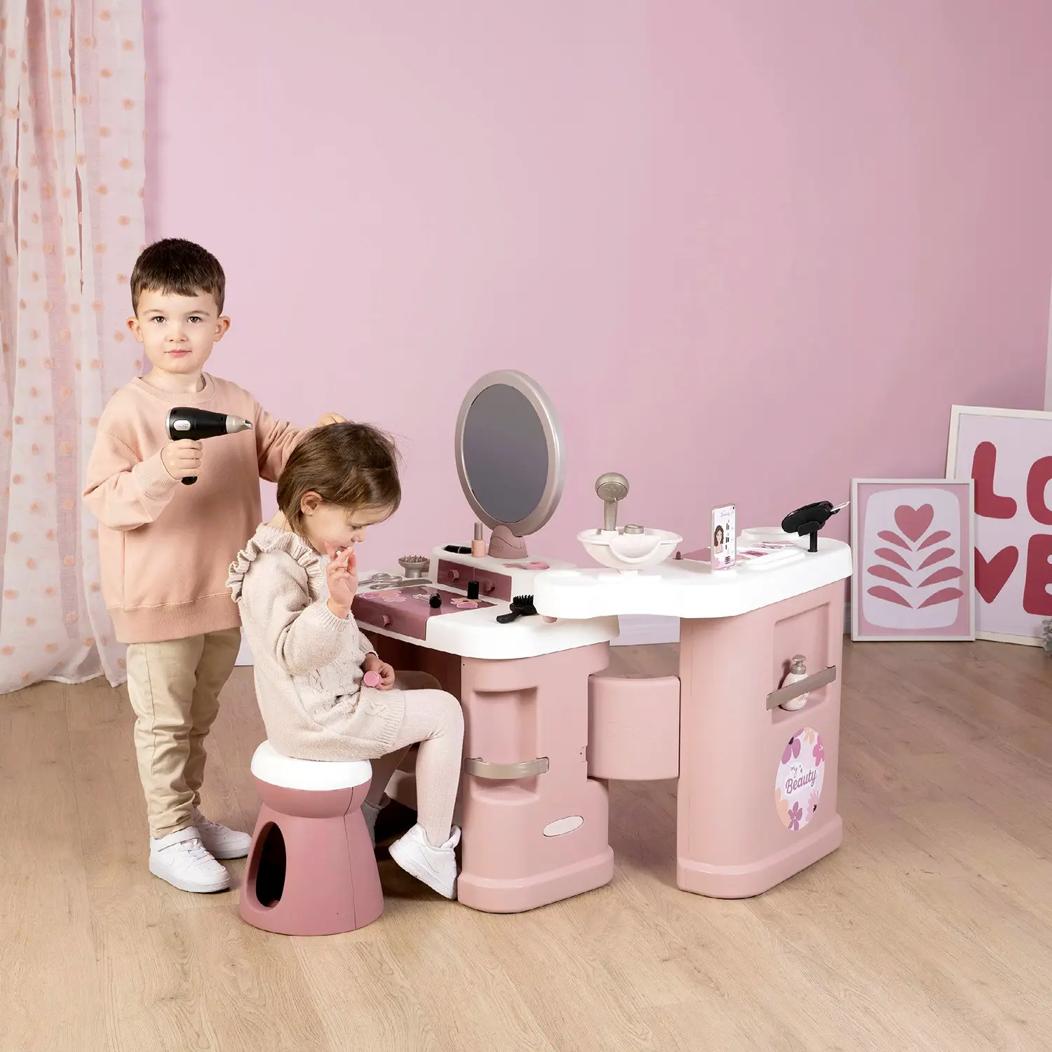 - ✅ 32 accessori interattivi inclusi: phon con luce, piastra, trucchi finti e lampada UV giocattolo.