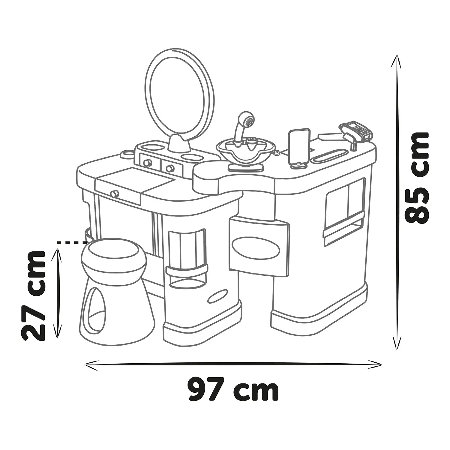 32 accessori e funzioni interattive - Tra cui phon con luce e suono, piastra, trucchi finti, lampada UV giocattolo. Il tutto richiudibile per salvare spazio. Batterie non incluse.