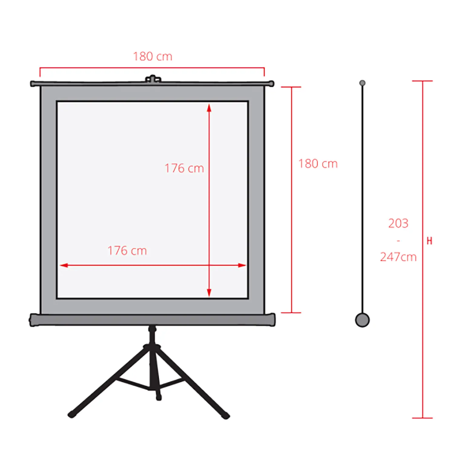 Prestazioni di proiezione professionali Lo schermo Tripod Junior offre un’area netta di visione di 176x176 cm in formato 1:1, con bordi neri da 2 cm per un migliore contrasto. Perfetto per presentazioni, home cinema e proiezioni nitide in qualsiasi ambiente.