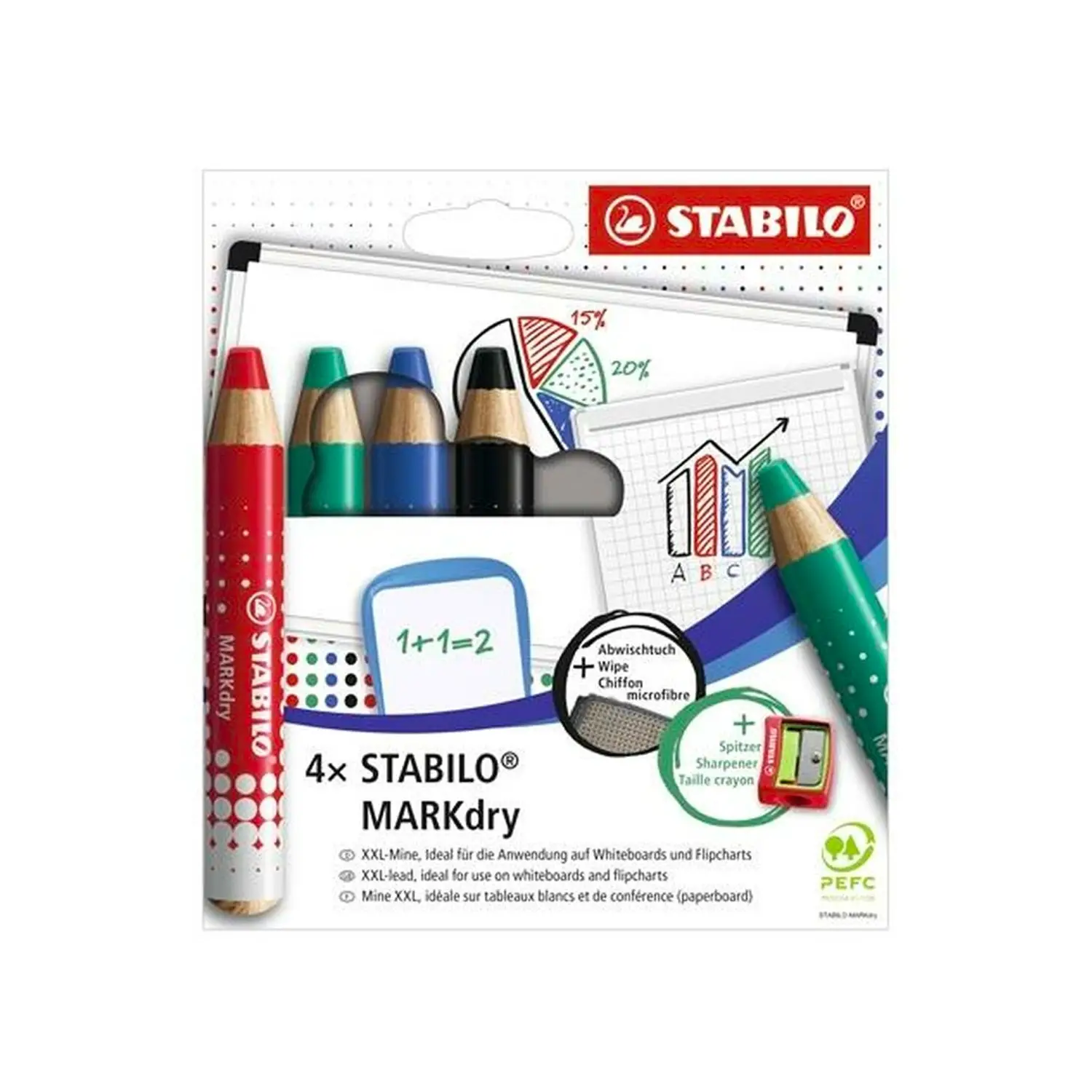 Matitoni per Lavagna Bianca Stabilo MARKdry – 4 Colori con Temperamatite e Cancellino