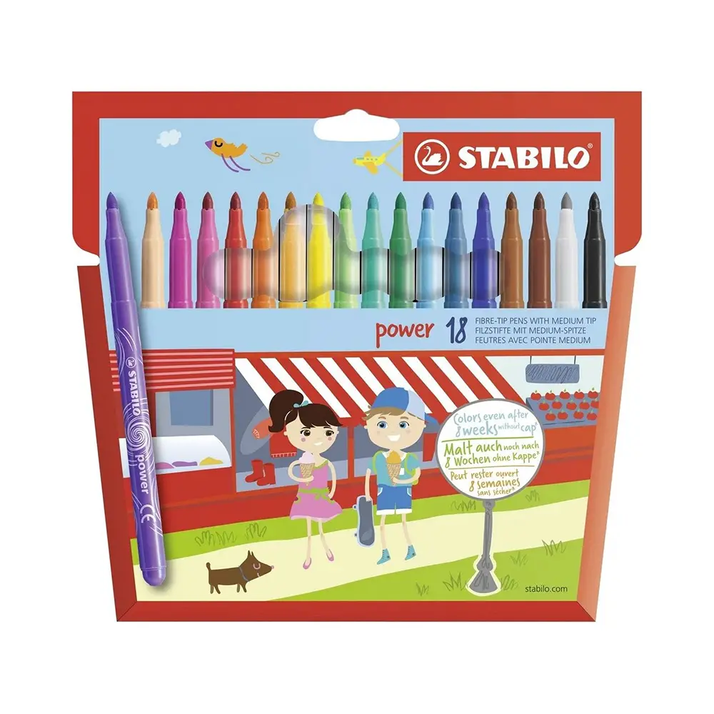 Include 18 pennarelli STABILO Power originali, disponibili in colori vivaci e brillanti, perfetti per disegni, lavoretti e attività creative scolastiche.