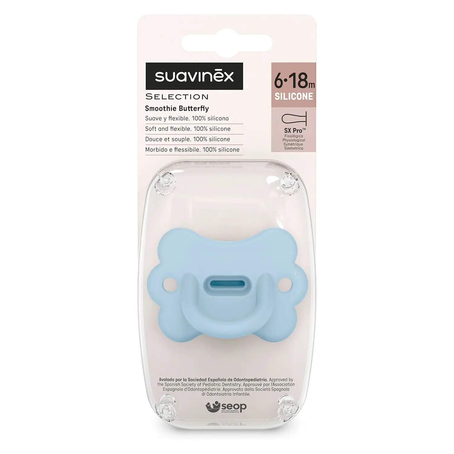 Ciuccio in silicone Suavinex: comfort evoluto dai 6 mesi Il ciuccio Smoothie Butterfly Suavinex è realizzato interamente in silicone ultra morbido. Indicato per bambini dai 6 ai 18 mesi, è dotato di scudo a farfalla e tettarella fisiologica SX Pro.