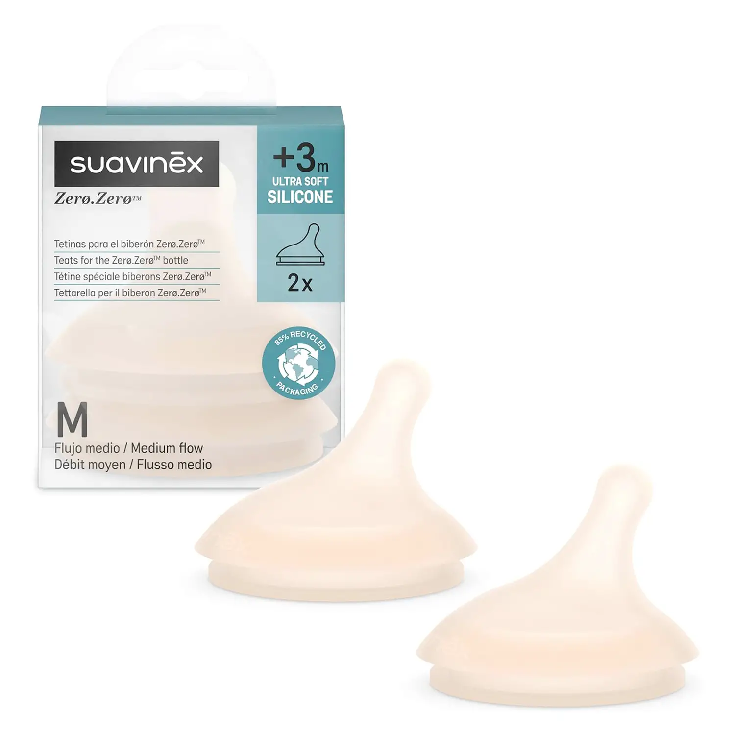 Confezione da 2 Tettarelle di Ricambio per Biberon Zero Zero Set di due tettarelle compatibili esclusivamente con i biberon anticolica Suavinex Zero Zero. Offrono un flusso medio (M) ideale per bambini dai 3 mesi in su, adatto a liquidi di media densità come latte, succhi e pappe leggere.