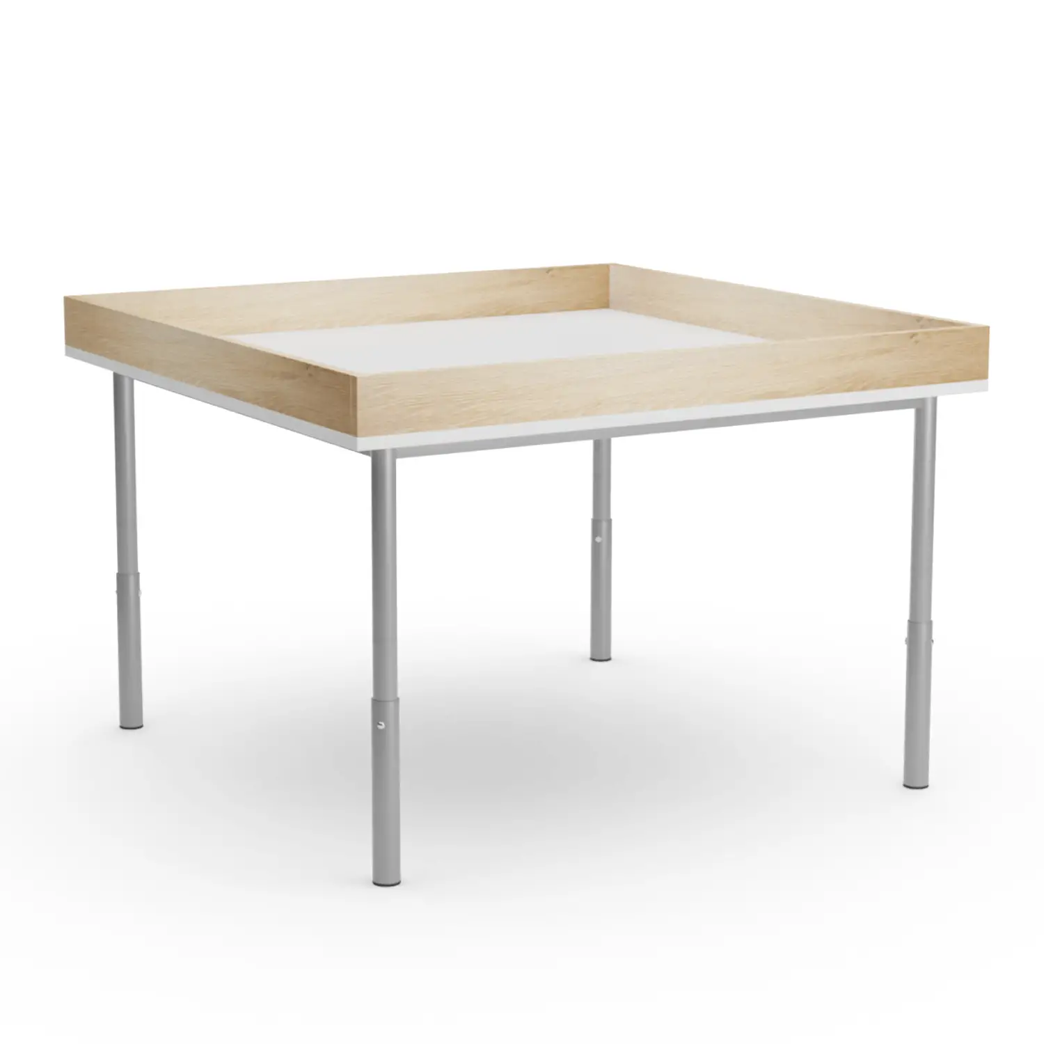 - ✅ Tavolo multifunzione per coding, robotica, tinkering e lavoro di gruppo, con piano bianco e spondine effetto rovere.