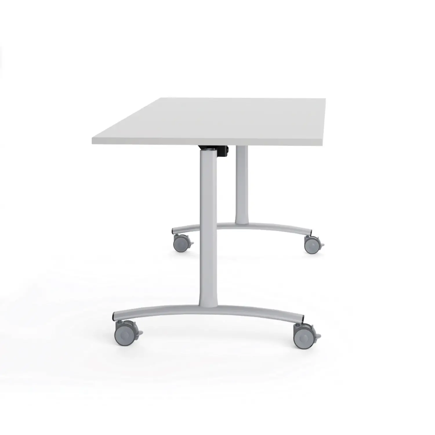 Grazie al piano ribaltabile e alle ruote, il tavolo può essere spostato, impilato e riposto con facilità, adattandosi a ogni esigenza di spazio.