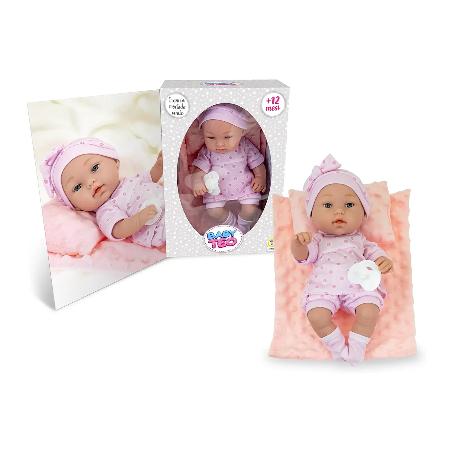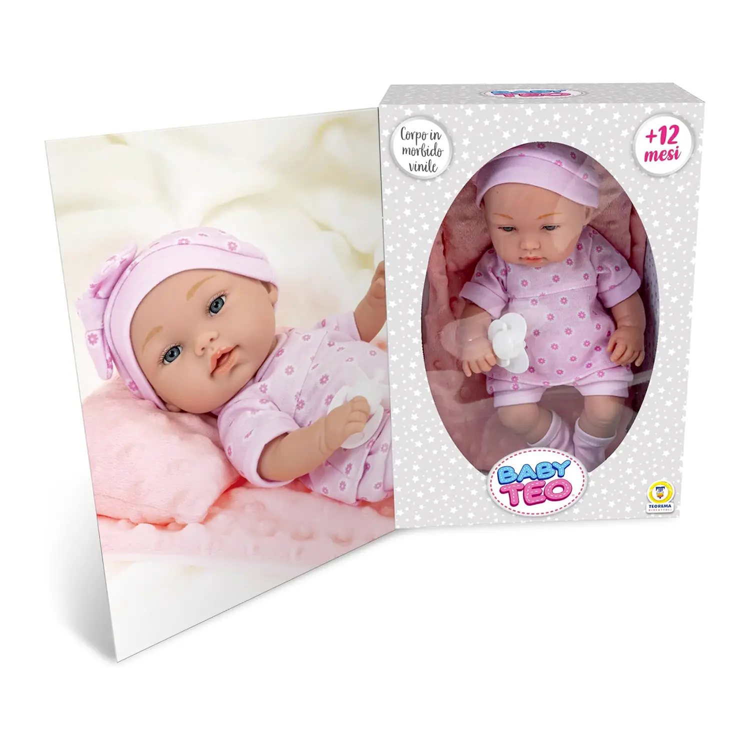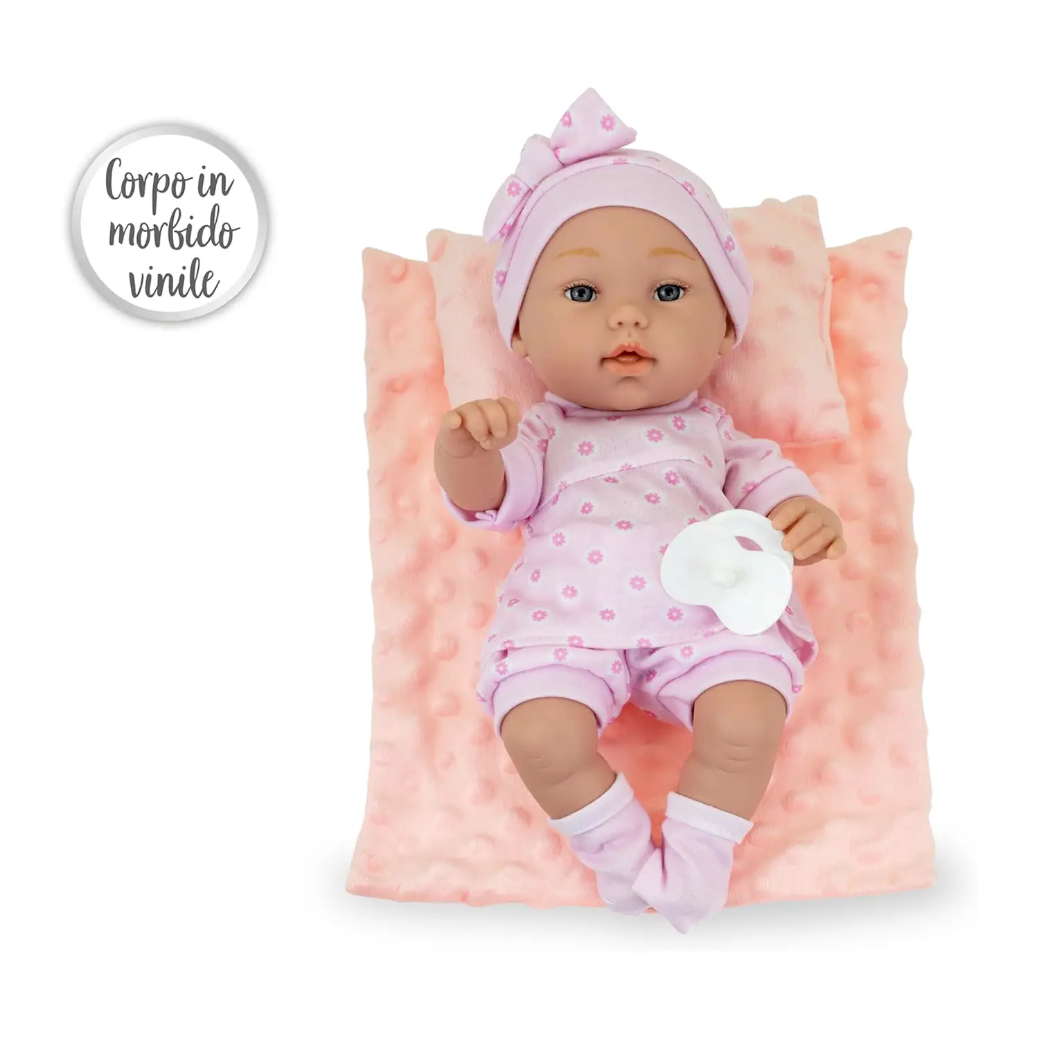 Design esclusivo bambola vinile morbido Scopri la bambola in vinile dal design esclusivo, con corpo morbido e completo rosa floreale. Un cappellino coordinato completa l’elegante look. Bambola vinile per bambini 12 mesi Perfetta per bambini dai 12 mesi, questa bambola sviluppa capacità motorie e sociali attraverso il gioco. Accessori bambola vinile cuscino ciuccio Include un cuscino rosa con texture a rilievo e un ciuccio bianco, ideali per il gioco di ruolo. Materiali qualità dettagli realistici Realizzata in vinile di alta qualità, sicura e resistente. Lineamenti delicati e dettagli realistici completano la bambola.