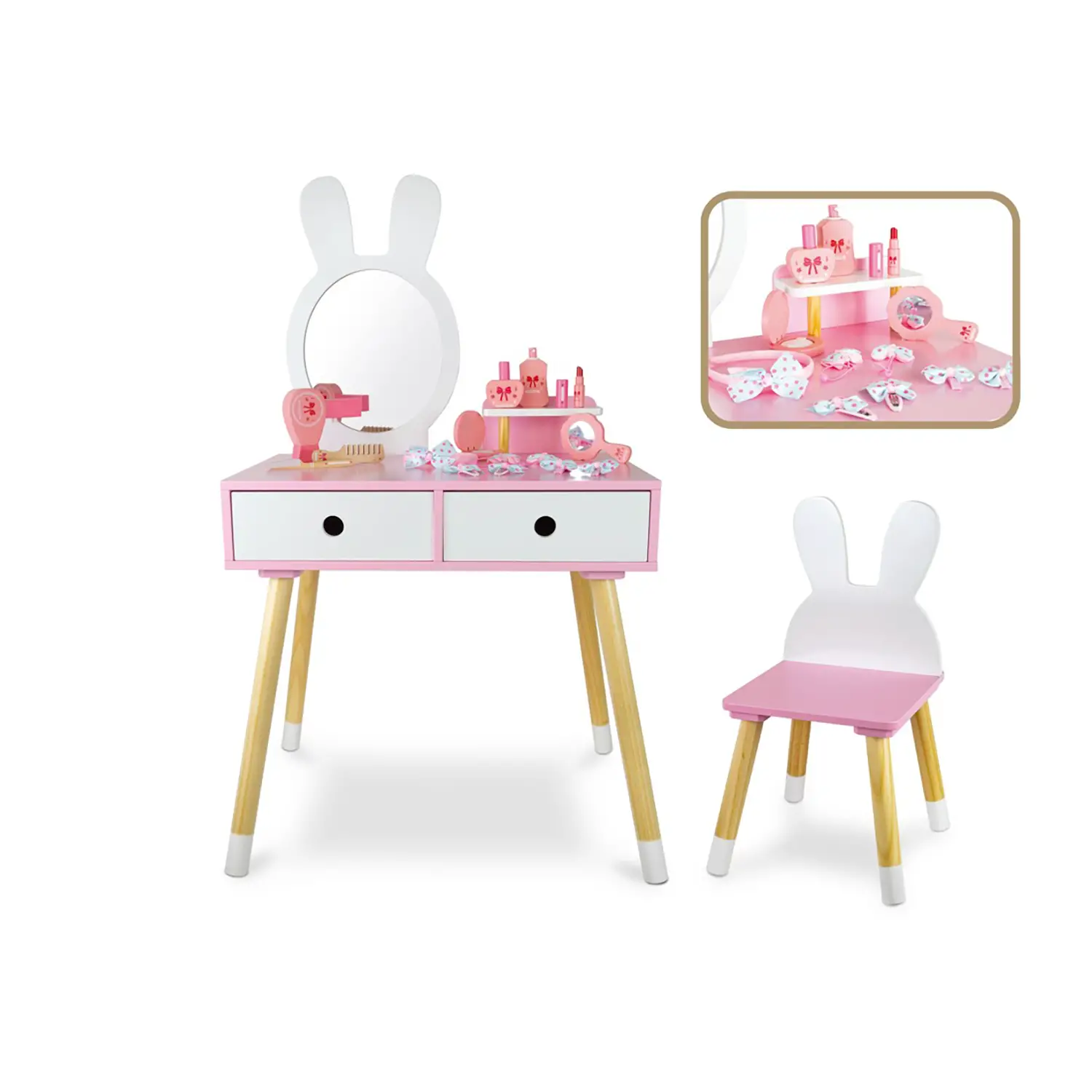 Specchio con dettagli a tema Lo specchio con due simpatiche orecchie da coniglietta rende il gioco ancora più fantasioso. Un dettaglio pensato per stimolare la creatività e l’immaginazione, trasformando la specchiera in un accessorio decorativo e funzionale.